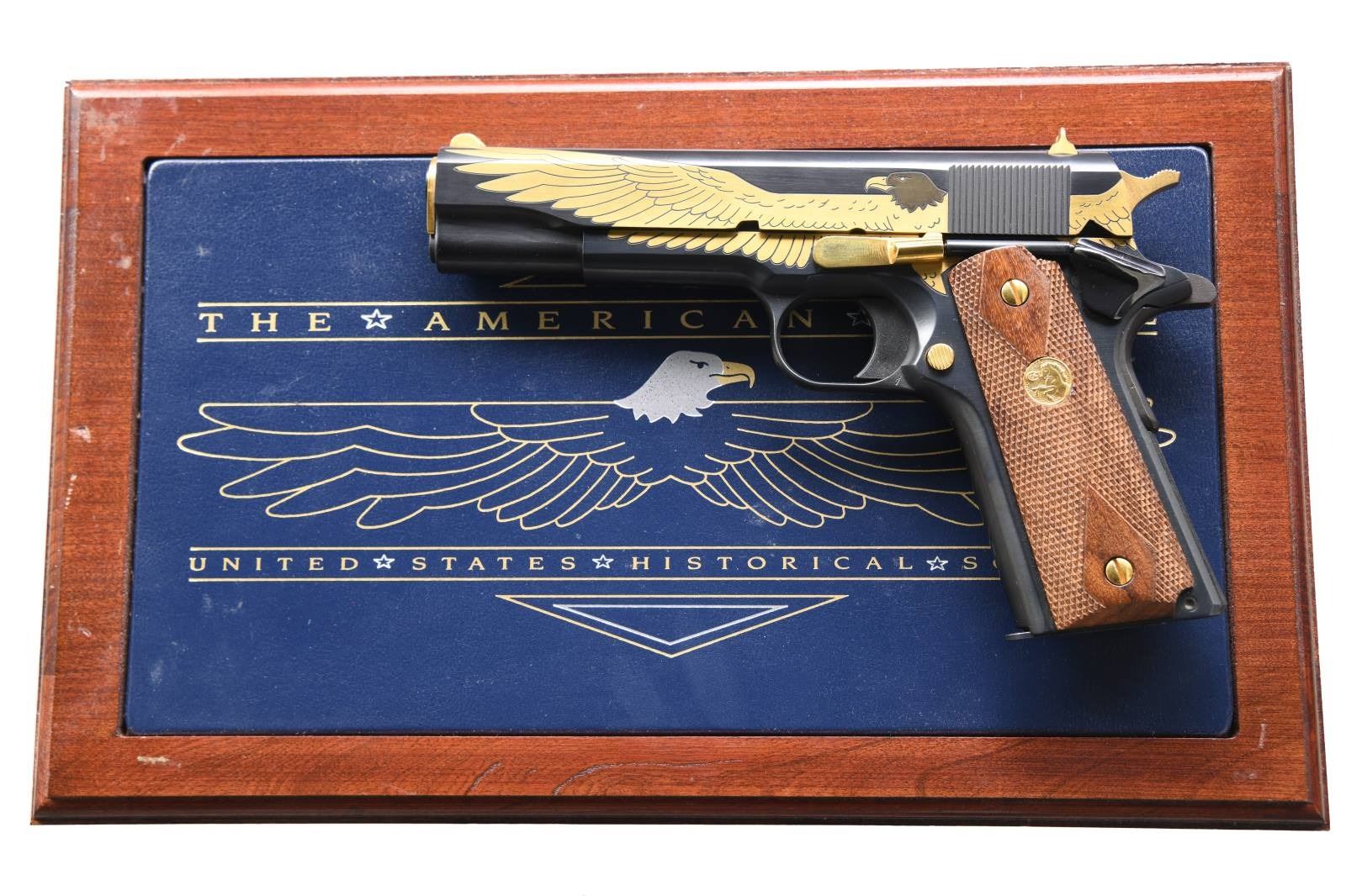 EAGLE 1911 A1 PISTOL. Cal. 45 ACP. S# 2723567. Bbl. 5". Limited edition pistol with a blued finish and gold-plated open-winged eagles on both sides of the slide and frame. Bbl. bushing, sights, hammer, mag. release, and grip screws are gold-finished. Two-piece checkered walnut grips with gold rampant colt medallions. MAGS: 1 Colt-marked, 7 rd., detachable. UNATTACHED ACCESSORIES: housed in a walnut presentation box. Exterior lid has a blue synthetic leather inlay with American eagle markings. Inside lid has an American flag. Blue, fitted interior with American eagle brass plate. Box contains a Colt hangtag. Exterior of the box shows dents & marks. CONDITION: as new. (23-6284/DS). MODERN. $800-1,200.