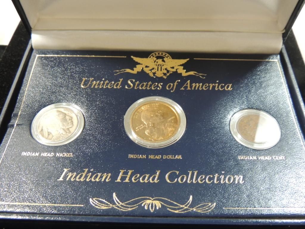 IN CASE. INDIAN HEAD NICKEL, INDIAN HEAD DOLLAR, INDIAN HEAD CENT. AS SHOWN.SEE PHOTO FOR MORE DETAILS.