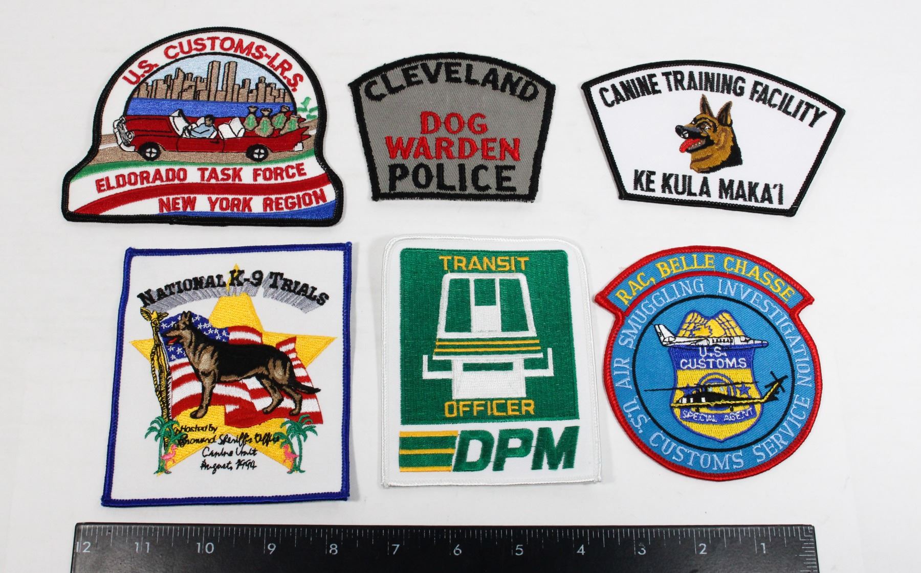 HAWAII CLEVELAND K-9 TRIALS UNITED STATES OF AMERICA USA POLICE LAW ENFORCEMENT PATCH BADGE INSIGNIA K-9, U.S. CUSTOMS I.R.S. ELDORADO TASK FORCE PATCH, UNITED STATES, DPM DETROID TRANSIT OFFICER PATCH, AND U.S. CUSTOMS SERVICE SMUGGLING INVESTIGATION PATCH RAC, BELLE CHASSE US U.S. CUSTOMS UNITED STATES OF AMERICA VINTAGE LAW ENFORCEMENT POLICE INSIGNIA PATCH CREST USA