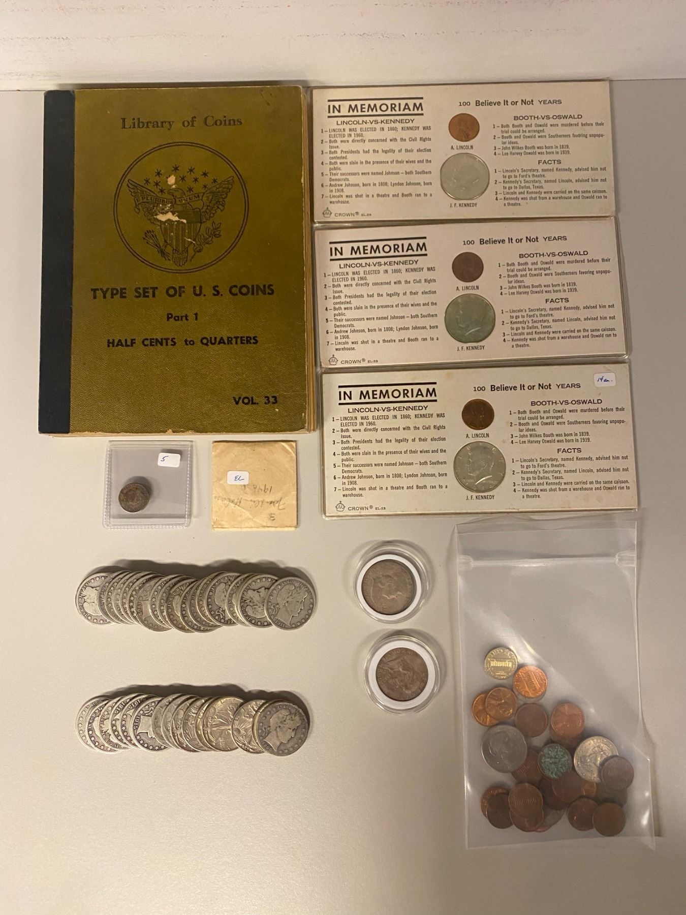 UNITED STATES: LOT of 133 coins, lot of miscellaneous U.S., predominantly Barber halves, and including a Hawaiian 10 cents, in two plastic tubes, a Library of Coins album, 2x2s and capsules, 3 Kennedy & Lincoln cards, and loose coins (including one German); average circulated grades, with some better, viewing recommended; retail value $800, lot of 133 coins.