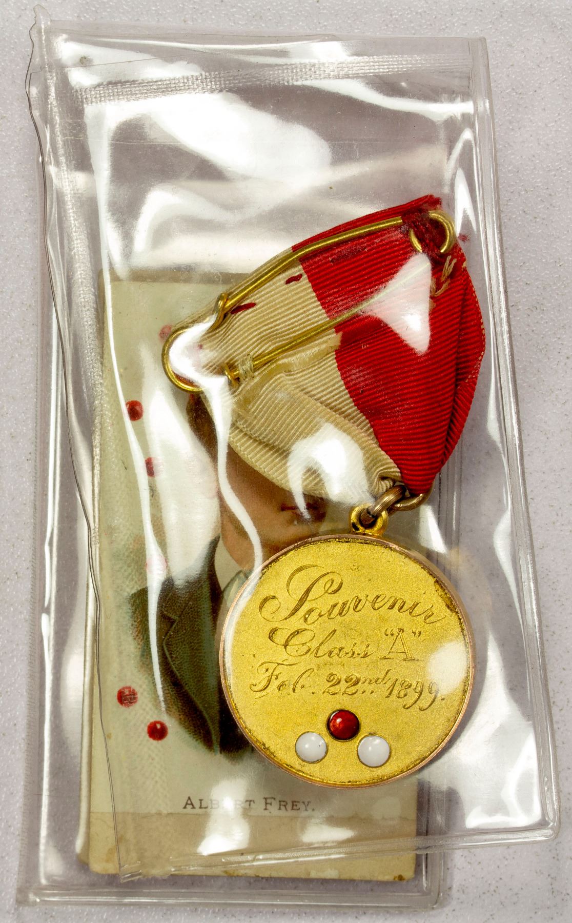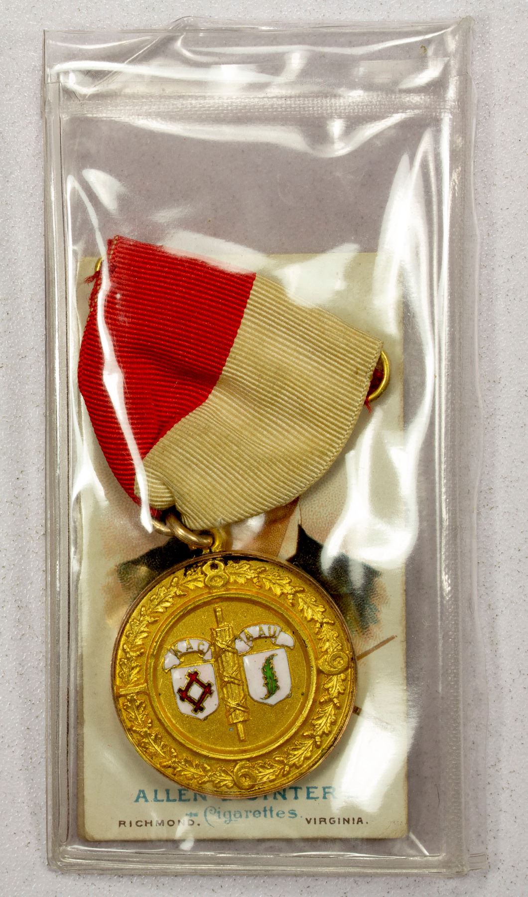 UNITED STATES: LOT of 3 items, includes 1899 30mm gilt medal for a Class A Billiards Championship depicting a fasces with 2 flanking coats of arms and with loop, ring, and ribbon with pin for suspension, along with two Allen & Ginter Tobacco playing cards of the period depicting J. Schaefer (Billiards Champion) and Albert Frey (Pool Champion), average circulated grades, with the medal better, bottom of Frey card damaged, in sealed plastic, viewing recommended; retail value $275, lot of 3 pieces. Tentative attribution for the medal.