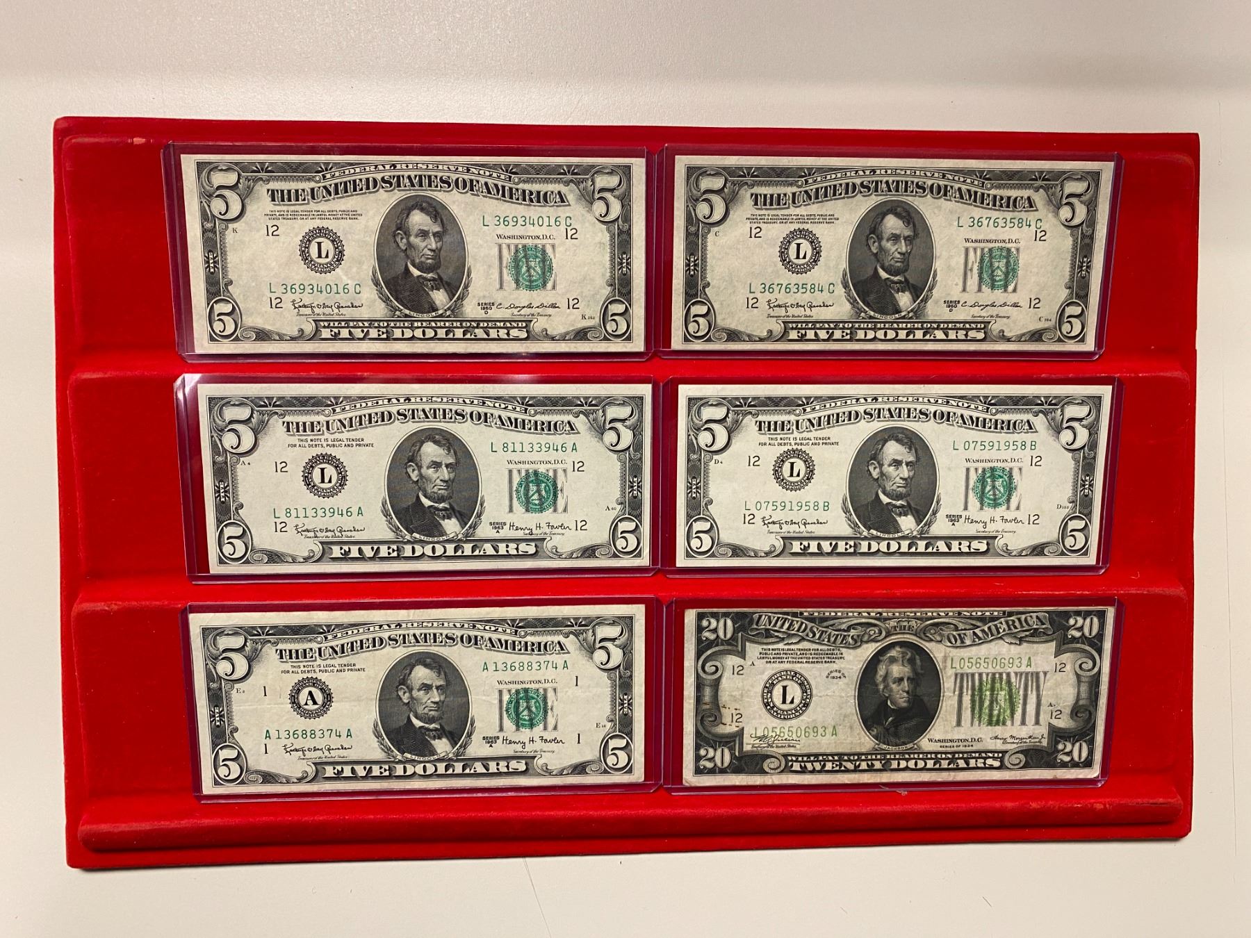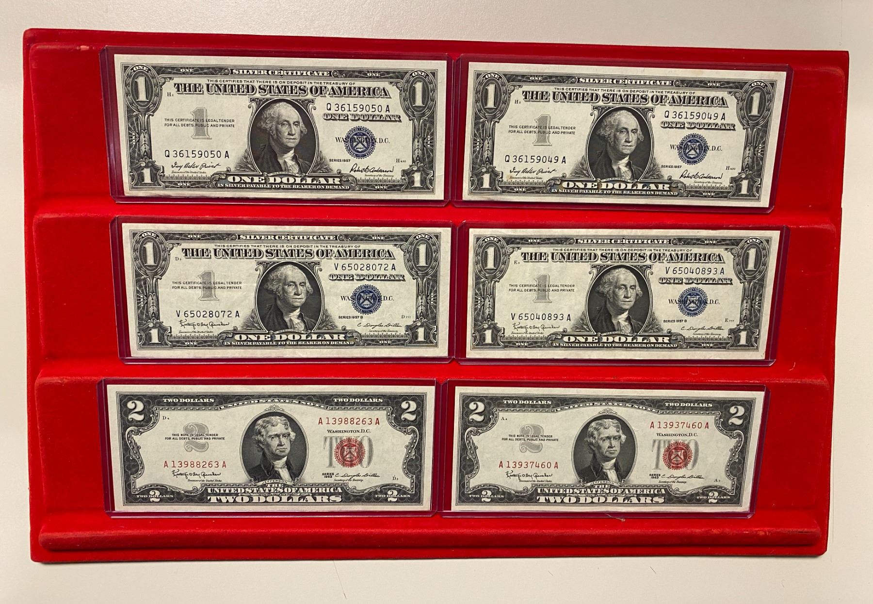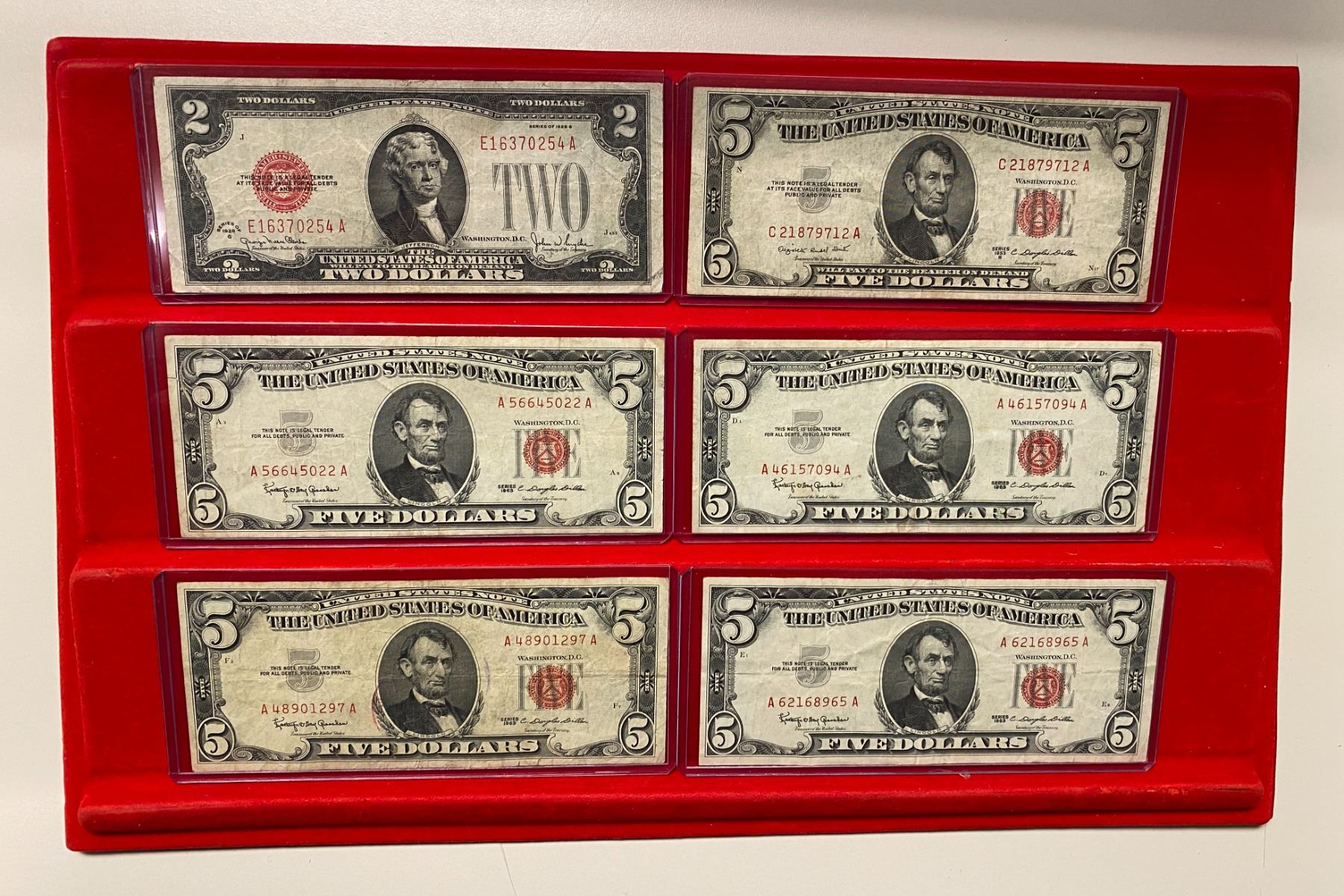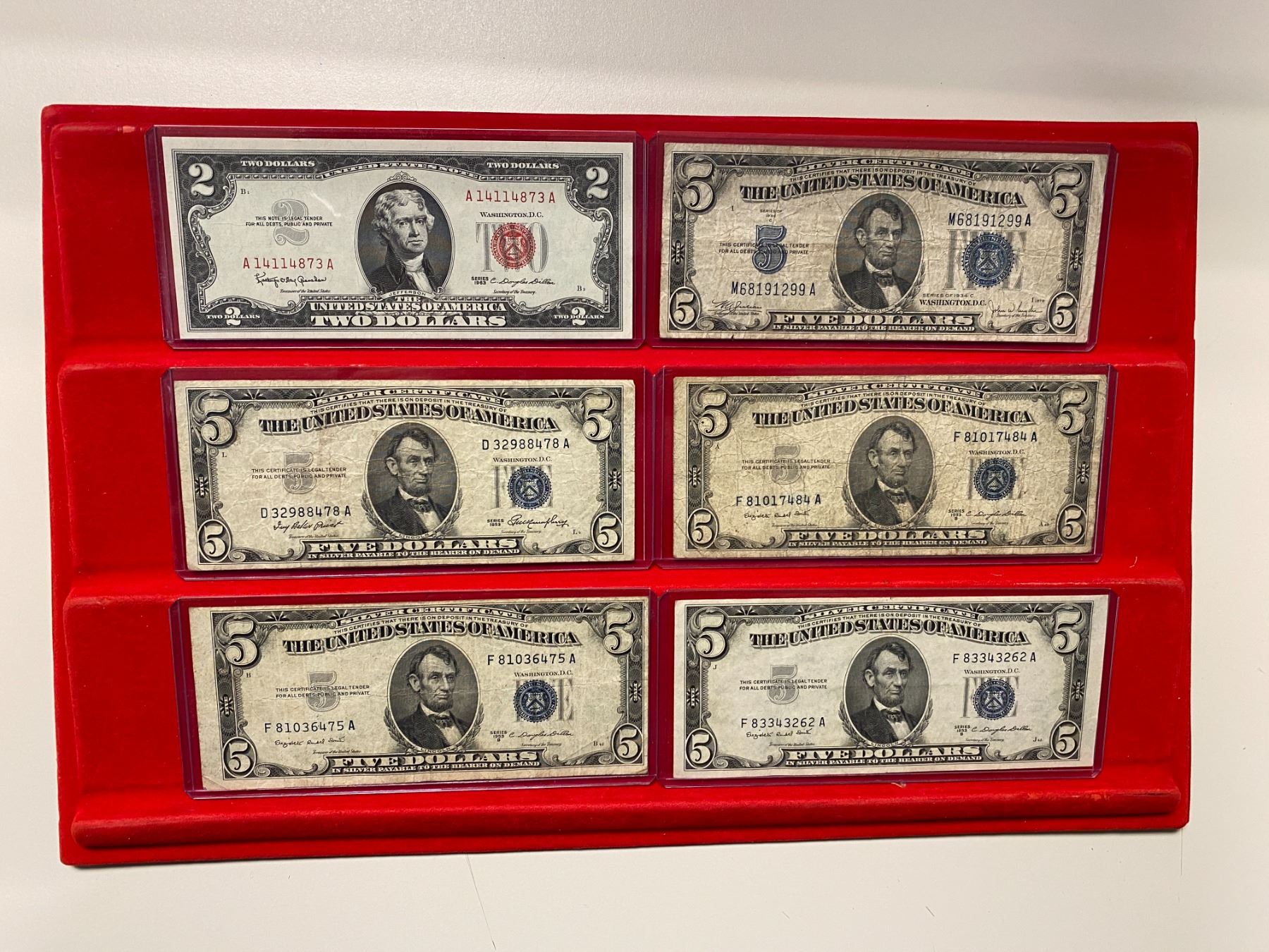 UNITED STATES: LOT of 56 banknotes, all small-size notes, including Silver Certificates: $1: 1928-A (1 pc), 1935-A (2), 1935-A North Africa (1), 1935-C (1), 1935-D (3), 1935-E (1), 1957 (5), and 1957-B (2); and $5: 1934-C (1), 1953 (1), and 1953-B (3); United States Notes: $2: 1928-G (1) and 1963 (9); $5: 1953-B (1) and 1963 (8, including one star note); and Federal Reserve Notes: $1:1963-A (2) and 1963-B (2), with a few fancy serial numbers; $5: 1934-A (1), 1950-D (3), and 1963-A (3); and $20: 1934 (2) and 1934-A (3); grades range from VG-Fine to Gem Unc, in consignor's holders, viewing recommended; retail value $875, lot of 56 pieces.