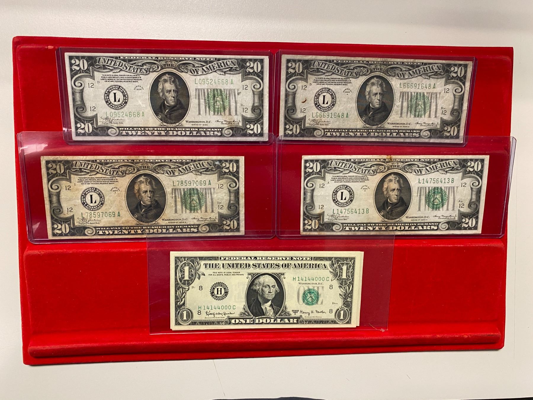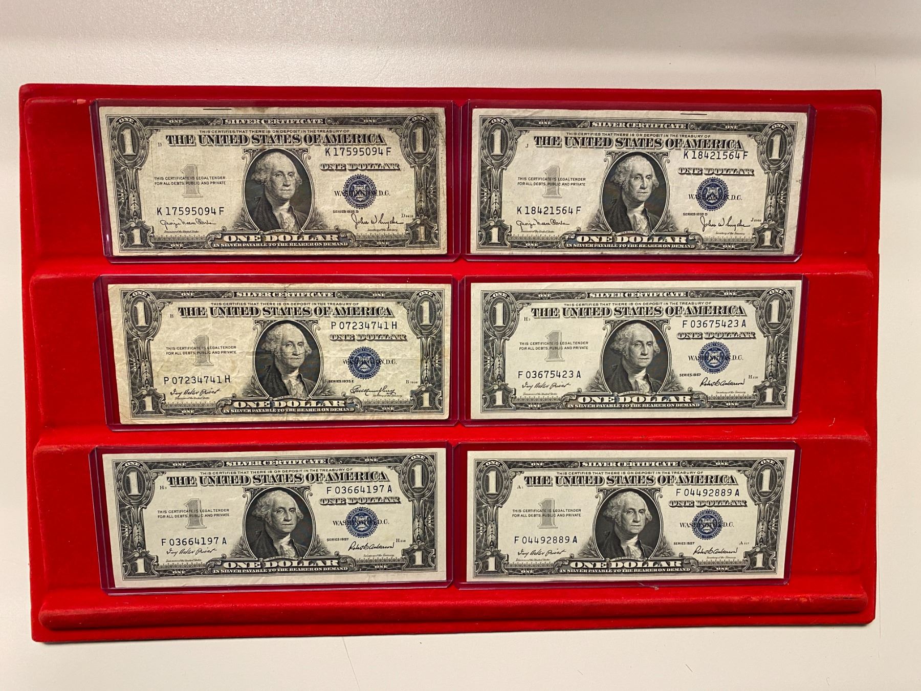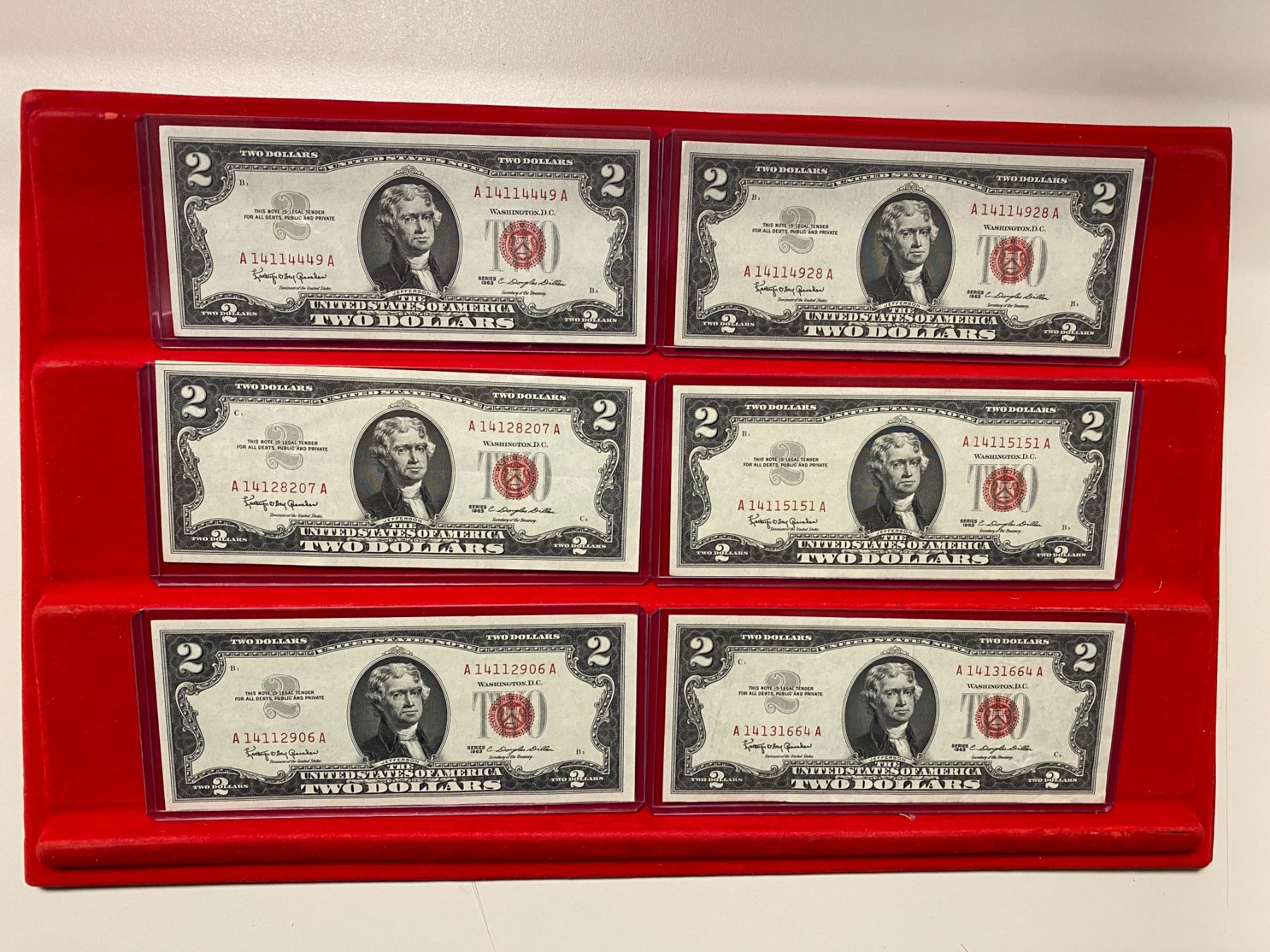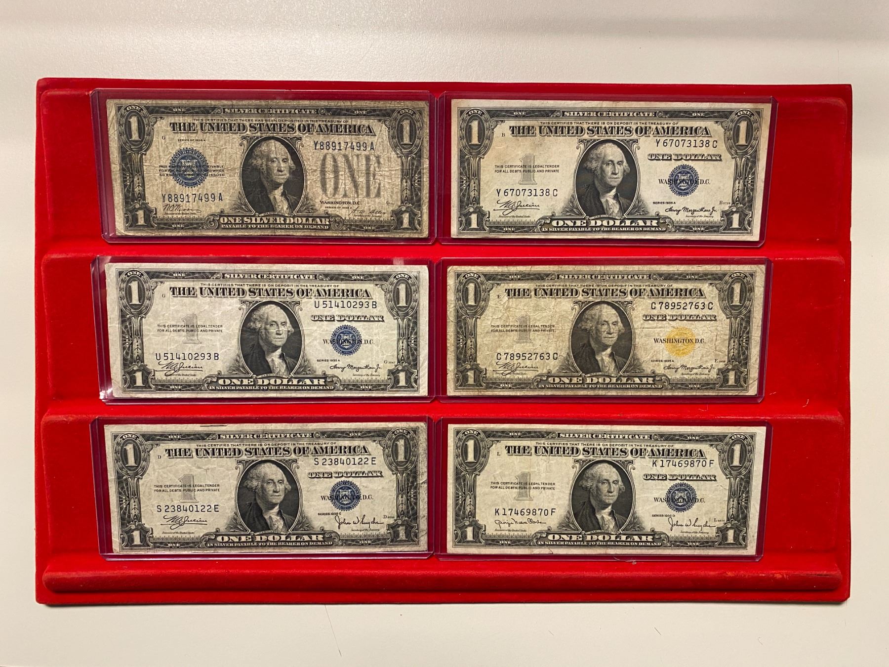 UNITED STATES: LOT of 56 banknotes, all small-size notes, including Silver Certificates: $1: 1928-A (1 pc), 1935-A (2), 1935-A North Africa (1), 1935-C (1), 1935-D (3), 1935-E (1), 1957 (5), and 1957-B (2); and $5: 1934-C (1), 1953 (1), and 1953-B (3); United States Notes: $2: 1928-G (1) and 1963 (9); $5: 1953-B (1) and 1963 (8, including one star note); and Federal Reserve Notes: $1:1963-A (2) and 1963-B (2), with a few fancy serial numbers; $5: 1934-A (1), 1950-D (3), and 1963-A (3); and $20: 1934 (2) and 1934-A (3); grades range from VG-Fine to Gem Unc, in consignor's holders, viewing recommended; retail value $875, lot of 56 pieces.