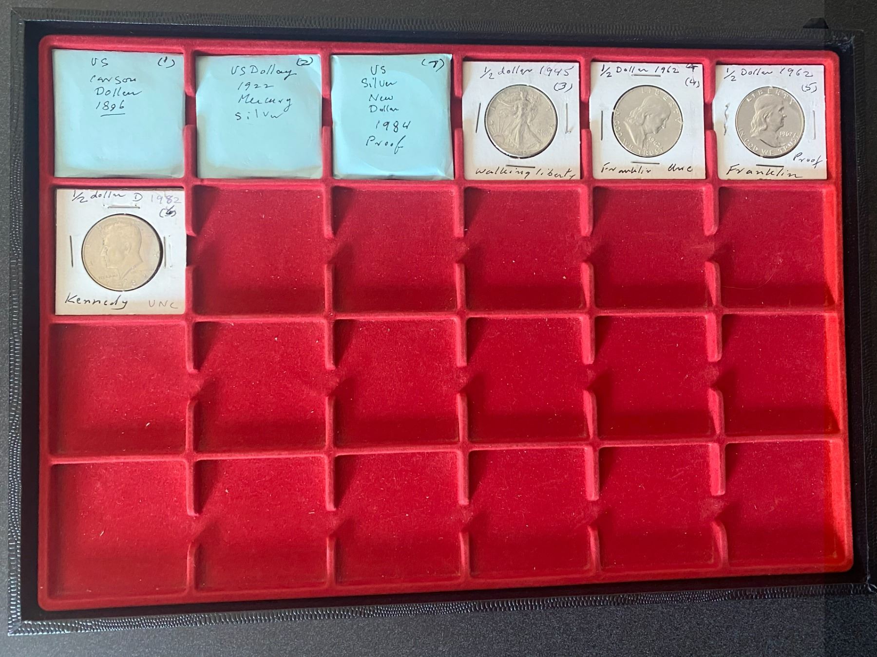 UNITED STATES: LOT of 6 silver & 1 clad coins dated 1987, Half dollar: 1945 (EF), 1962 (2 pcs, one BU and one Proof), and 1987-D (BU); and Dollar: 1896 (AU), 1922 (AU) and 1984 (Olympics, Proof); retailvalue $200, lot of 7 pieces.