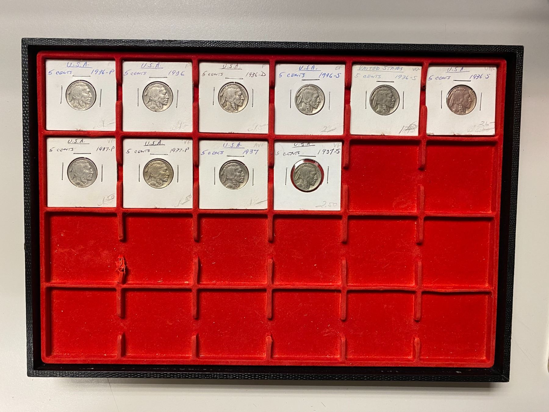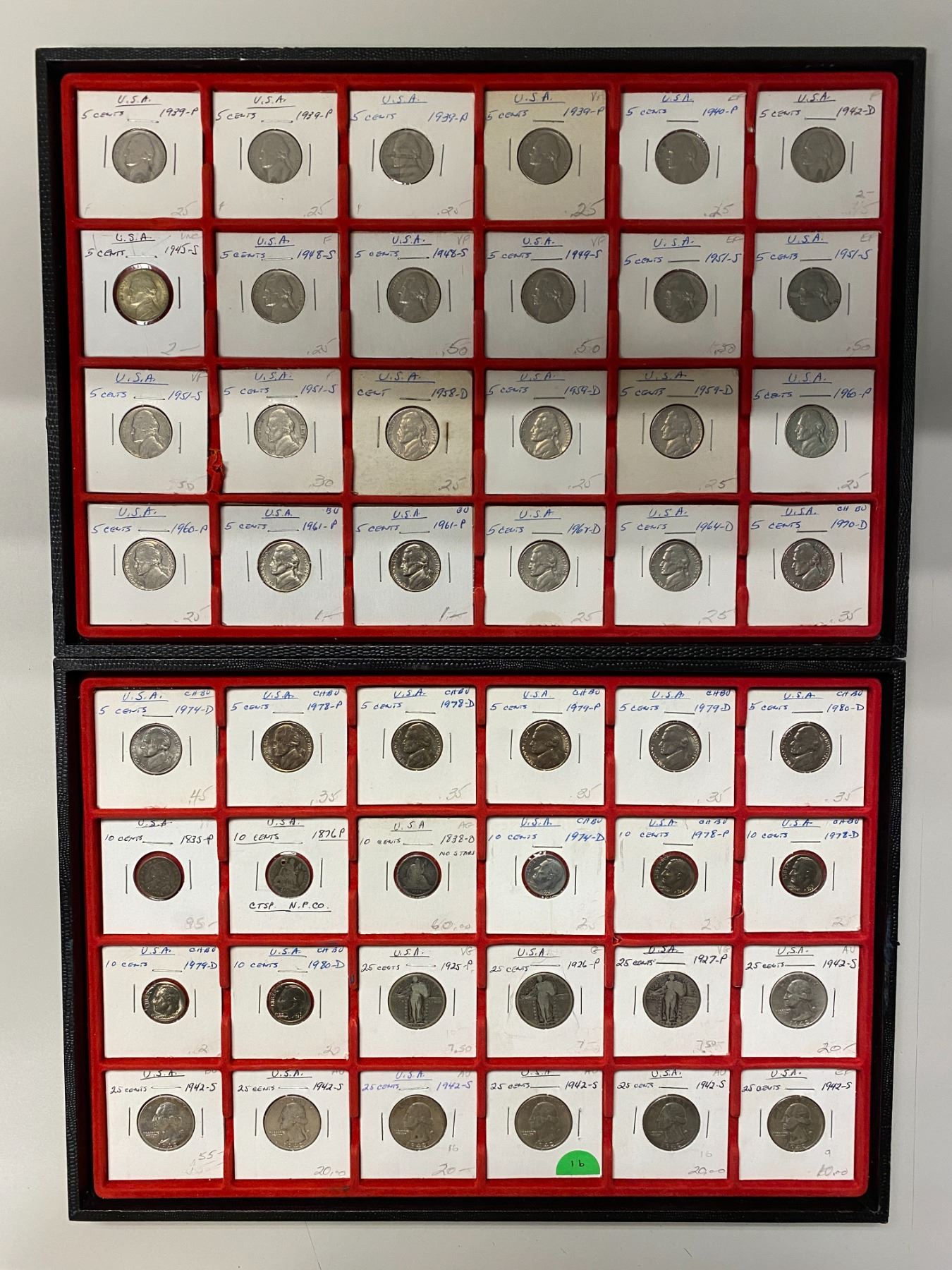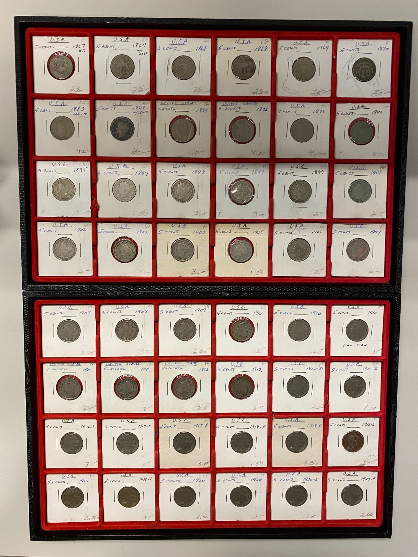 UNITED STATES: LOT of approximately 202 coins, including 2 cent coppers (3; VF-EF), 3 cent nickel (3; F-VF), shield nickels (11, 2 with rays, F-VF), liberty nickels (29; VG-AU), buffalo nickels (71; VG-EF), Jefferson nickels (30; EF-BU), an 1835 dime (F), 2 damaged seated dimes, 5 clad dimes, standing liberty quarters (3; G-VG), silver Washington quarters (11; AU-UNC), Columbian halves (5; F-EF), 4 commemorative halves (Maine, Stone Mountain, Lexington, B.T. Washington, mostly cleaned), Kennedy halves (10 clad; 8 silver & 2 CN), 13 dollar coins - 2 Morgan, 3 Peace, 3 CN Ikes, and 5 Susan B. Anthony, also one 1906 San Francisco So-called dollar (HK-340) VF; retail value $1,300, lot of approximately 202 pieces.