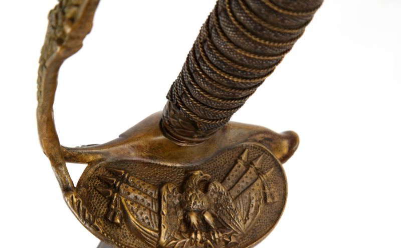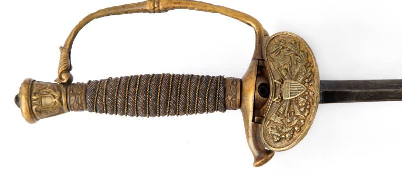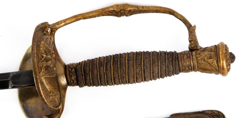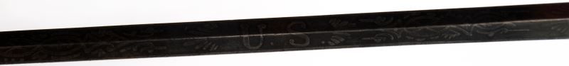 Sword measures approximately 37 inches in length. and comes with it's original scabbard. Sword features a wire wrapped leather grip. One side of cross guard is movable; other side is stationary. Ricasso is patterned and is marked "U.S.". Blade has some oxidation, scabbard has some scrapes present, chape has a few dents present; overall in good to very good condition.