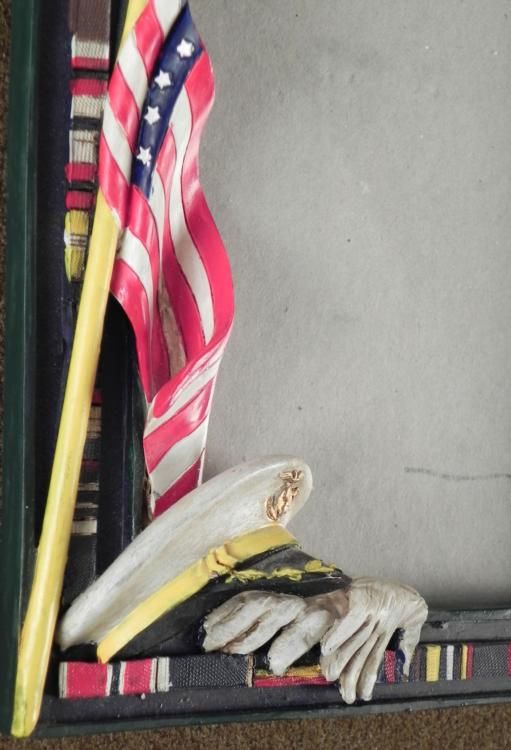 THIS IS AN UNITED STATES MARINES PHOTO FRAME. THE FRAME CONTAINS AN EMBLEM, FLAG & AWARDS WITH MARINE VISOR & GLOVES. IT IS A PLASTER TYPE FRAME WITH BACK A STAND. THE SYMBOLS IN FRONT ARE IN RELIEF. IT'S DIMENSIONS ARE 7" X 6" * *