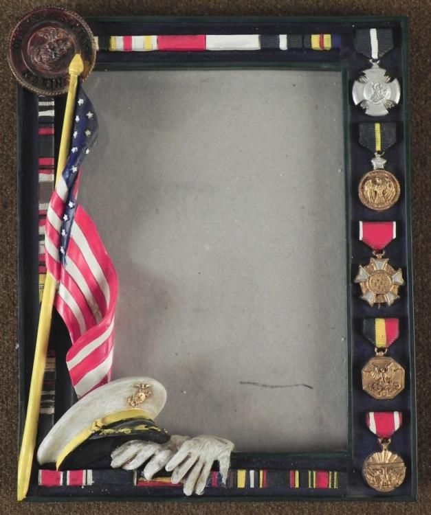 THIS IS AN UNITED STATES MARINES PHOTO FRAME. THE FRAME CONTAINS AN EMBLEM, FLAG & AWARDS WITH MARINE VISOR & GLOVES. IT IS A PLASTER TYPE FRAME WITH BACK A STAND. THE SYMBOLS IN FRONT ARE IN RELIEF. IT'S DIMENSIONS ARE 7" X 6" * *