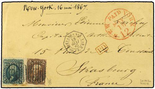 68a,76 1867 10c dark green + 5c brown, tied by grid cancels on 1867 cover to PARIS, France, red NEW YORK, MAY 18, PAID 12 exchange cds and French Packet transit cds, transit and receiving backstamps, 10c with perf toning at bottom, otherwise. Very fine.