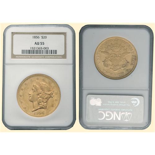 20 Dollars 1856, Philadelphia. Head of Liberty left / Arms. Friedberg 169.