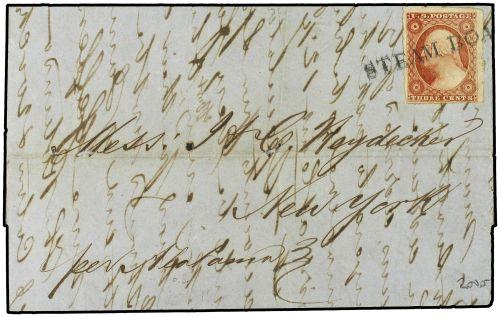 1856 (Sept 20) Entire letter from Savannah/GA to New York endorsed ´per Alabama´ franked by imperf. 1851 3c. with large margins at right, tied by straight line ´Steam Boat´ handstamp in black. Unusual and fine cover. Scott 11.