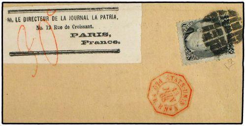 1868(June 13) Newspaper wrapper to Paris franked by single Black Jack 1861 2c black (grilled) tied black cork cancel with superb strike of ´ETATS UNIS-PAQ.FR.H.No.3´ (Salles 1713) in red, carried on the ´S.Laurent´ steamer. Remarkable and rare usage. [Scott 93?].