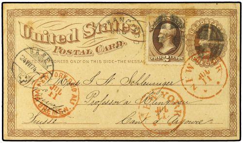 1874 (July 11) Pre UPU usage of 1 c. brown stationery card to SWITZERLAND; up-rated with additional Banknote 2 c. brown tied by cork cancels in black and SAN FRANCISCO despatch cds. Red NEW YORK-PAID ALL VIA BREMEN cds and BASEL arrival all on front of scarce card.
