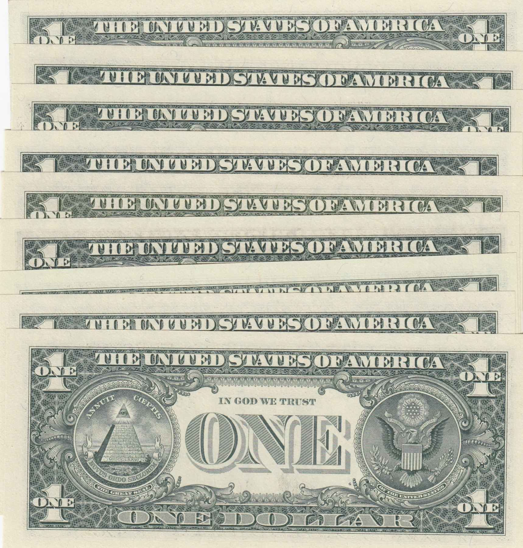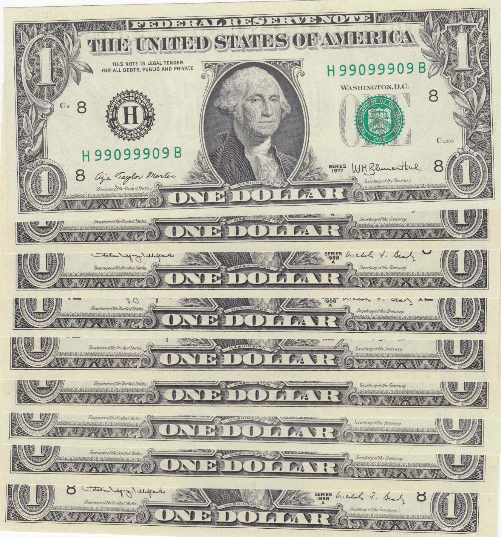 United States of America, 1 Dollar (9), 1977/1995, UNC, p462/p443/p480/p496, NICE NUMBERS, (Total 9 banknotes)