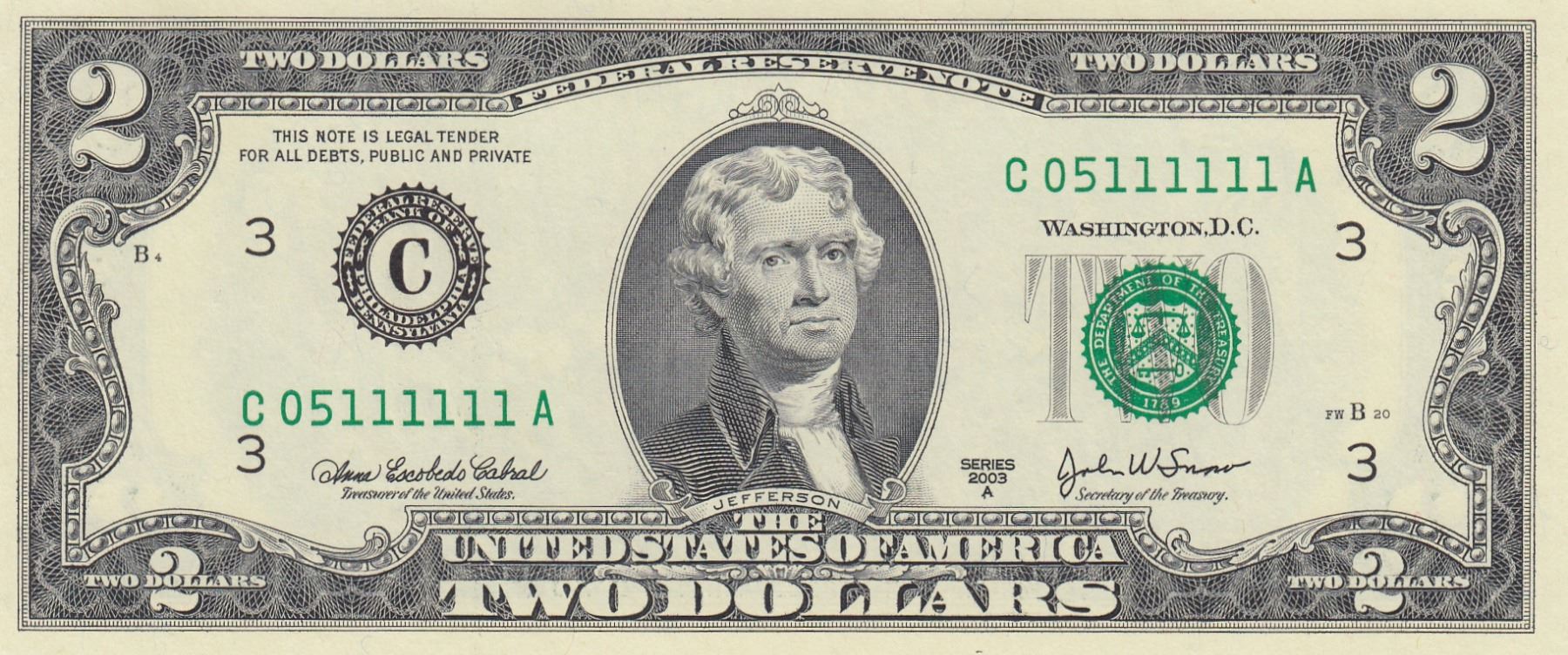 United States of America, 2 Dollars, 2003, UNC, p516, NICE SERIAL NUMBER