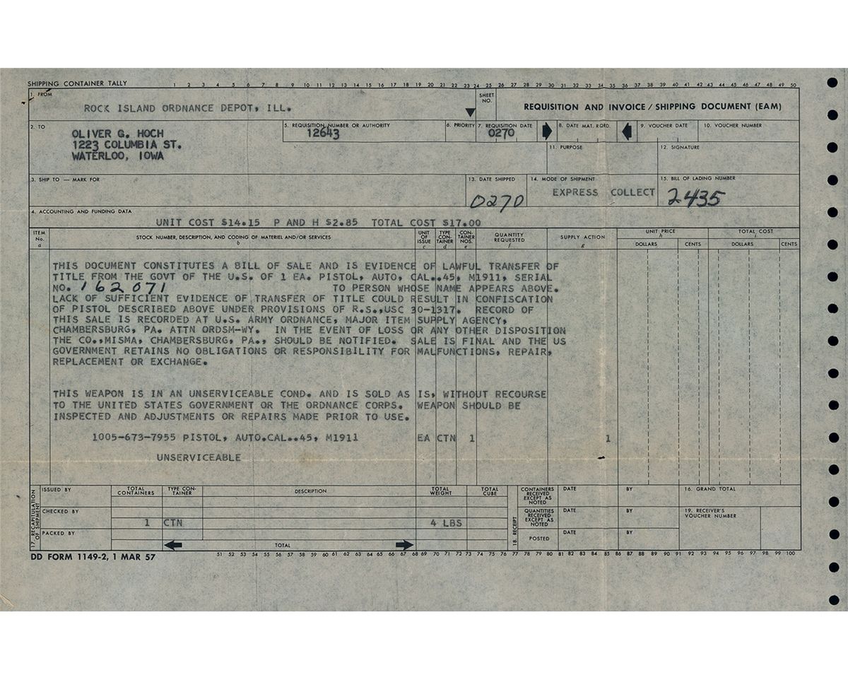 19. SHIPPING. If packing and handling of purchased lots is done by Rock Island Auction Company, it is done at the entire risk of the purchaser. All items must have shipping insurance; this insurance is mandatory. RIAC will not charge any labor charges for shipping. We are not liable for any acts of omission in packaging or shipping. Purchased lots handled by outside carriers or packers including those we may have recommended such carriers or packers may carry their own insurance and any claims for losses or damages should be addressed directly to them. We will arrange for packing and shipping at our earliest possible convenience. We will attempt to ship as soon as possible, however, due to our high volume of absentee bids shipping can take up to two weeks after full payment is received. In the case of crating or any exceptional packaging, the buyer will be charged our cost from outside agents. Buyer pays shipping, packing materials, and insurance charges.