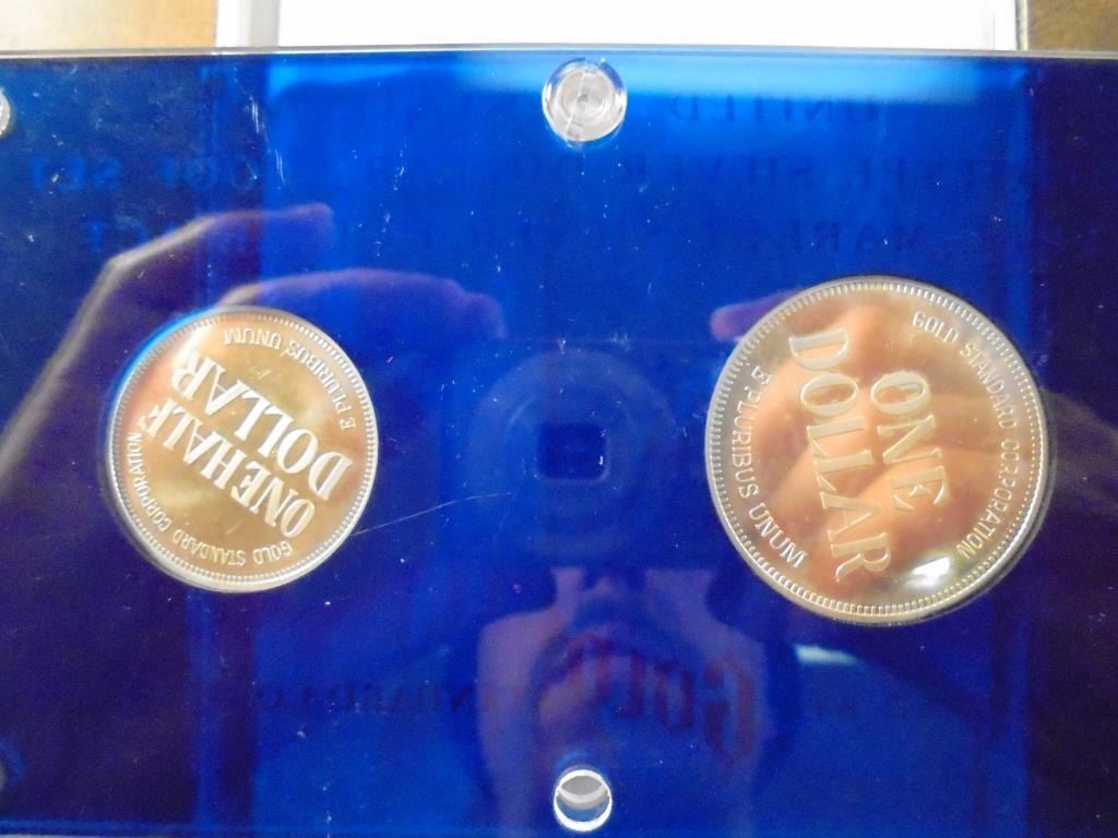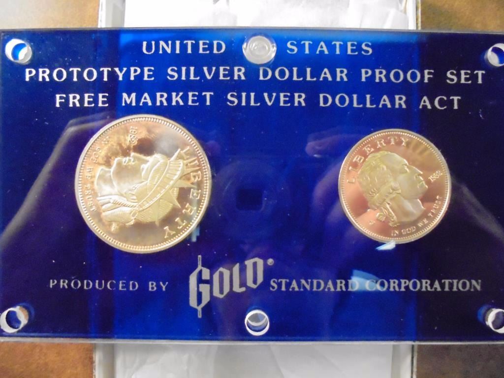 "FREE MARKET SILVER DOLLAR ACT", PRODUCED BY GOLD STANDARD CORP. IN CAPITAL PLASTICS HOLDER WHICH IS MISSING MOST OF THE PLASTIC SCREWS TO HOLD IT TOGETHER