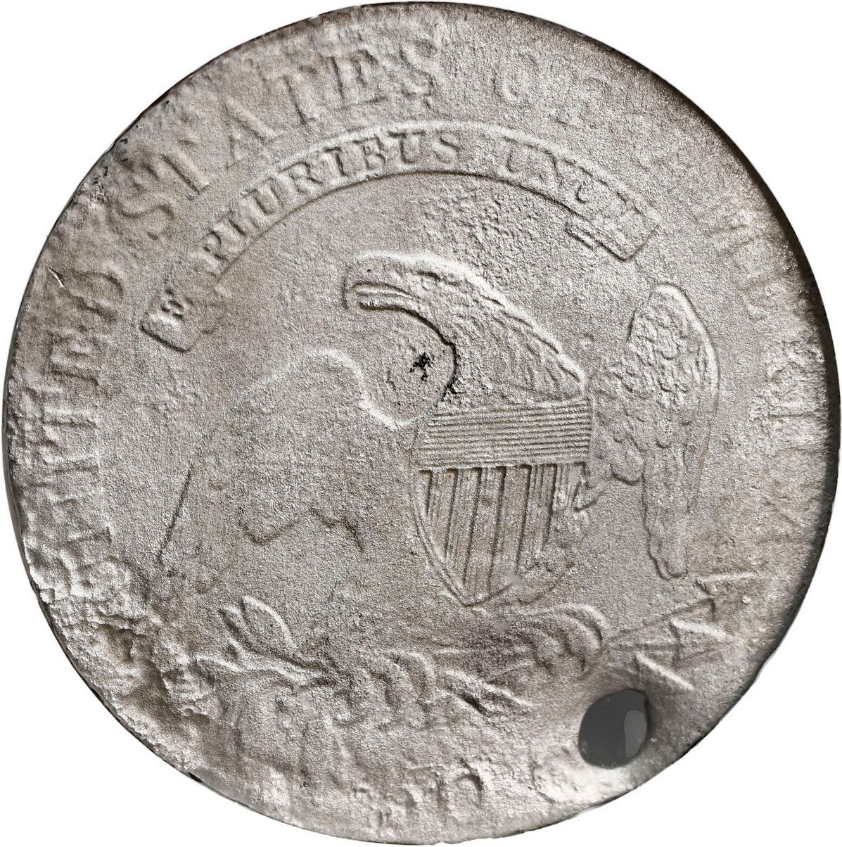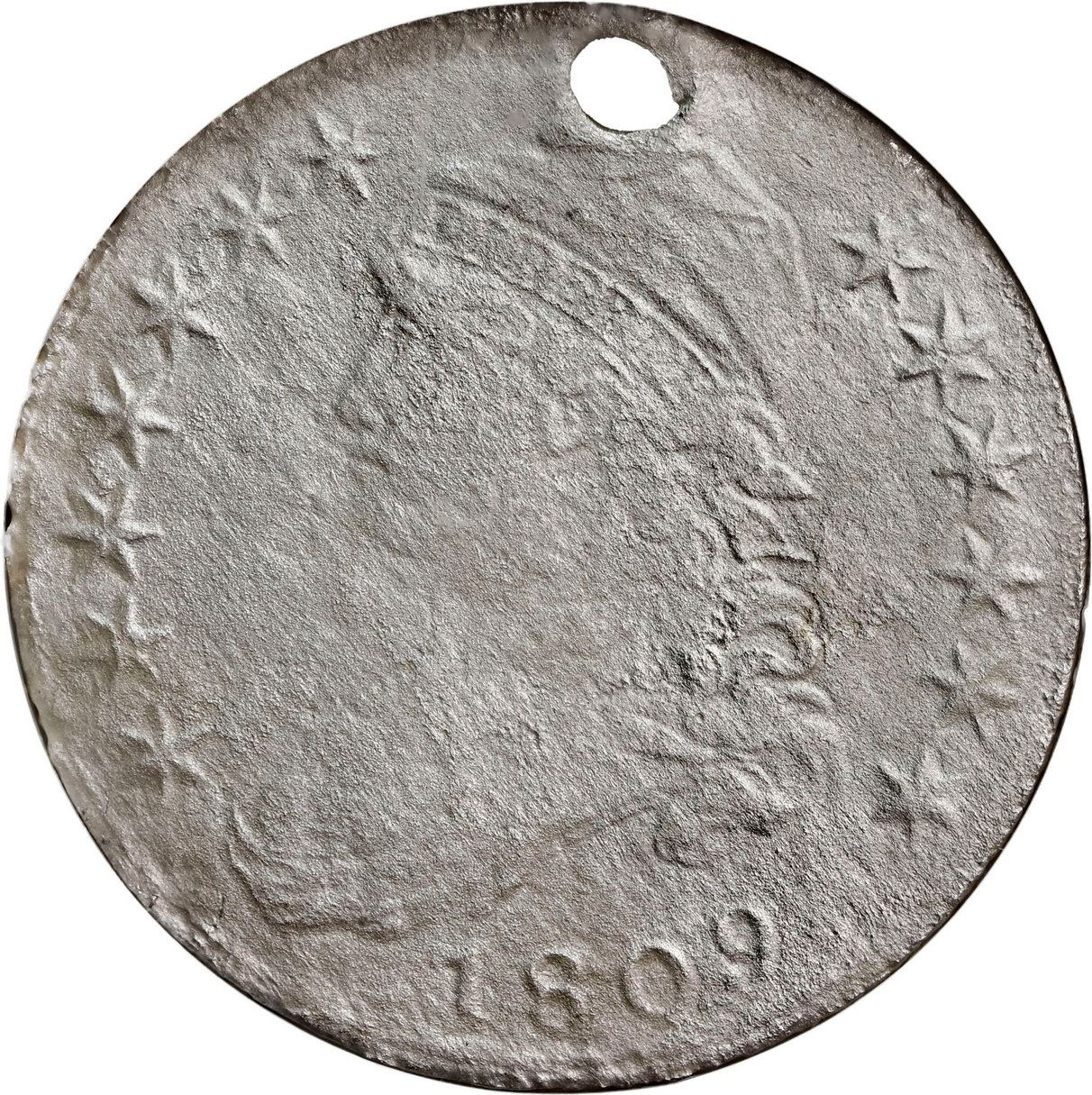 UNITED STATES, Philadelphia mint, Capped Bust half dollar, 1809, NGC Shipwreck Effect (SS New York Shipwreck Label). The SS New York shipwreck proved to be a fascinating time capsule of American "pocket change" in the early 1800s. This 1809 half dollar, while holed at the top and corroded by saltwater, has the sharp details of an XF or higher piece. Apparently it was holed for safekeeping after only a little circulation. This is also the earliest-date U.S. coin we've offered at auction from the SS New York. Recovered from: S.S. New York, sunk in 1846 off New Orleans