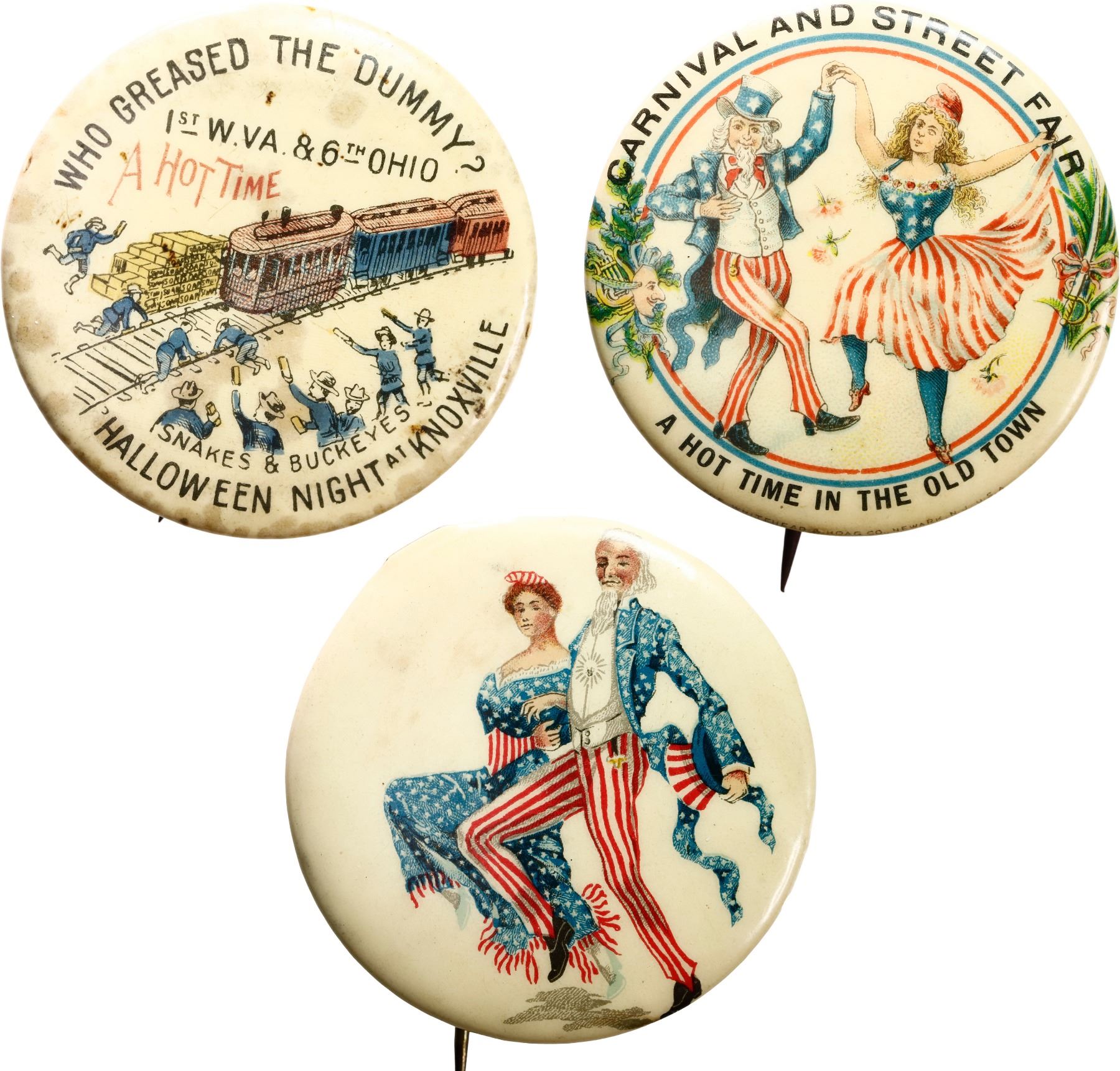 UNITED STATES, group of three Spanish-American War pins, circa 1898, Uncle Sam & "A Hot Time." 18.81 grams total. 45 mm. Large pin with Uncle Sam dancing with a patriotic woman, "CARNIVAL AND STREET FAIR" above and "A HOT TIME IN THE OLD TOWN" below; large pin with Uncle Sam and woman dancing; Large pin with soldiers greasing railroad tracks with soap, "WHO GREASED THE DUMMY?" "1st W.VA. & 6th OHIO" "A HOT TIME" above and "SNAKES & BUCKEYES" "HALLOWEEN NIGHT AT KNOXVILLE" below. The song "A Hot Time in the Old Town" was a popular American song for both civilians and the military during the Spanish American War. The third medal depicting the 1st W. Va. & 6th Ohio refers to those two Army units' stay at Camp Poland outside of Knoxville in October 1898 and the antics they got into as the war drew to a close.