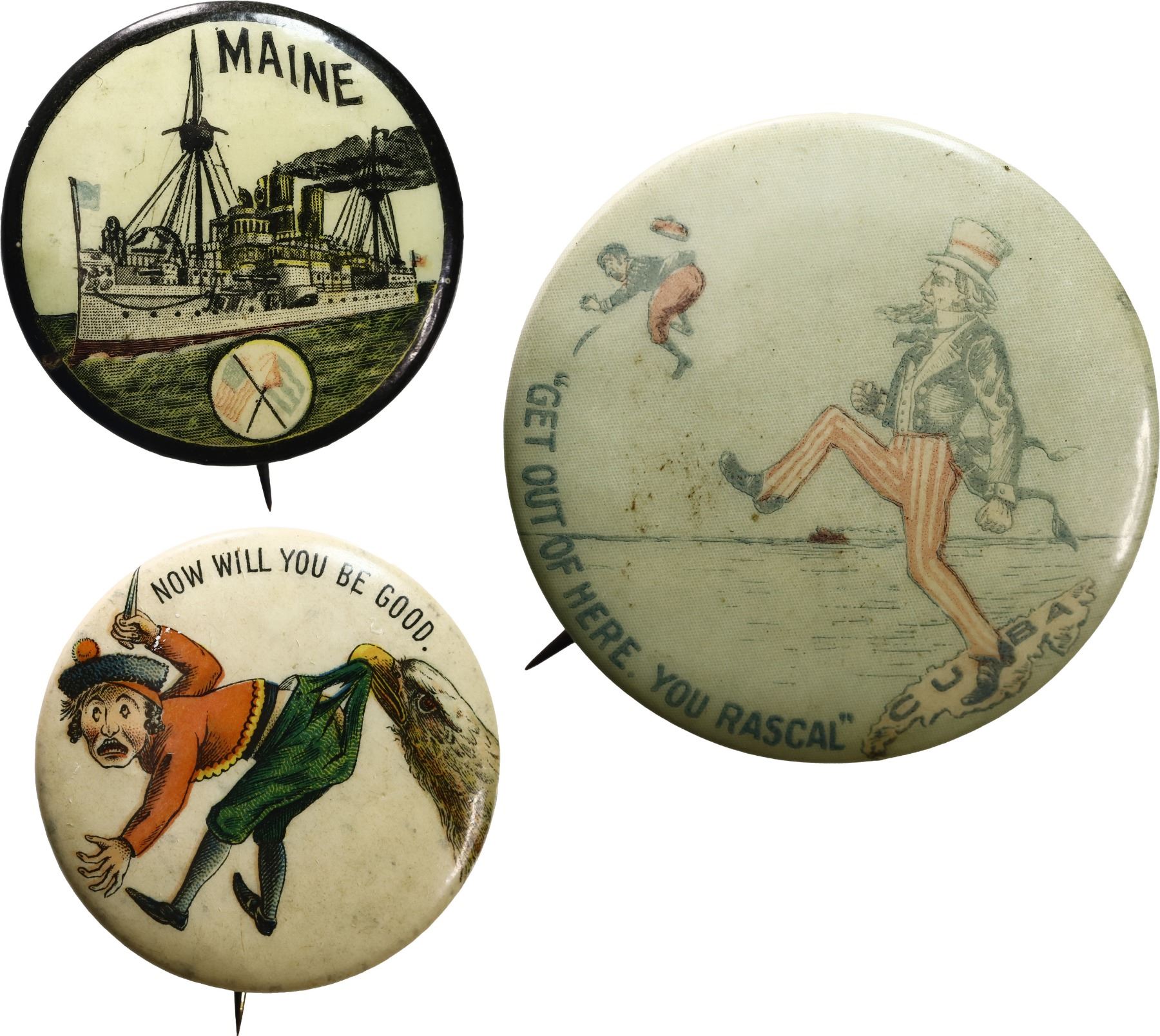 UNITED STATES, group of three Spanish-American War pins, circa 1898, ex-Rudman. 13.78 grams total. Large pin depicting Uncle Sam kicking a Spaniard out of Cuba with "Get out of here. You rascal." below; small pin with the battleship USS Maine above crossed American and Cuban flags, by H.A. Palmer & Co.; small pin with eagle hoisting a Spaniard by his pants with "Now will you be good." above, by Whitehead & Hoag. Interesting group of patriotic pins illustrating American sentiments after the sinking of the USS Maine and during the subsequent Spanish-American War. Pedigreed to the Isaac Rudman Collection.