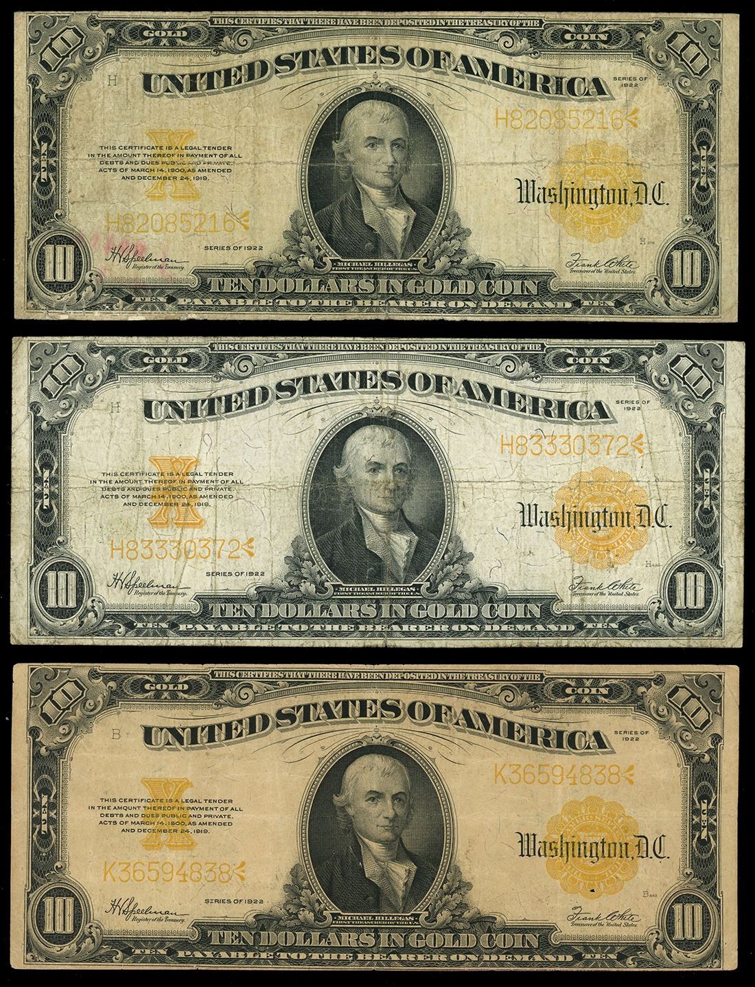 UNITED STATES, lot of three $10 Gold Certificates, series of 1922, Speelman-White.
