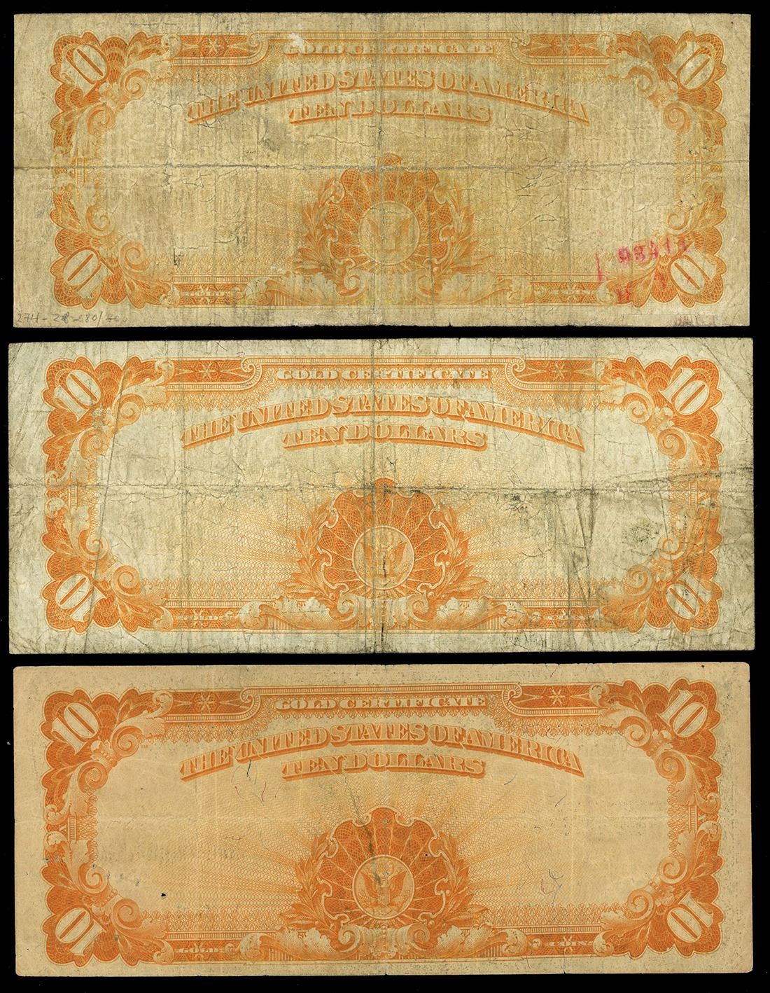 UNITED STATES, lot of three $10 Gold Certificates, series of 1922, Speelman-White. Fr-1173 (3). Generally F-VF, some staining, pinholes, and paper toning noted.