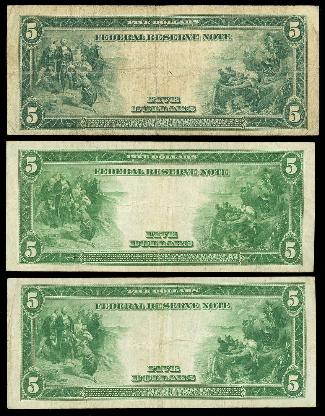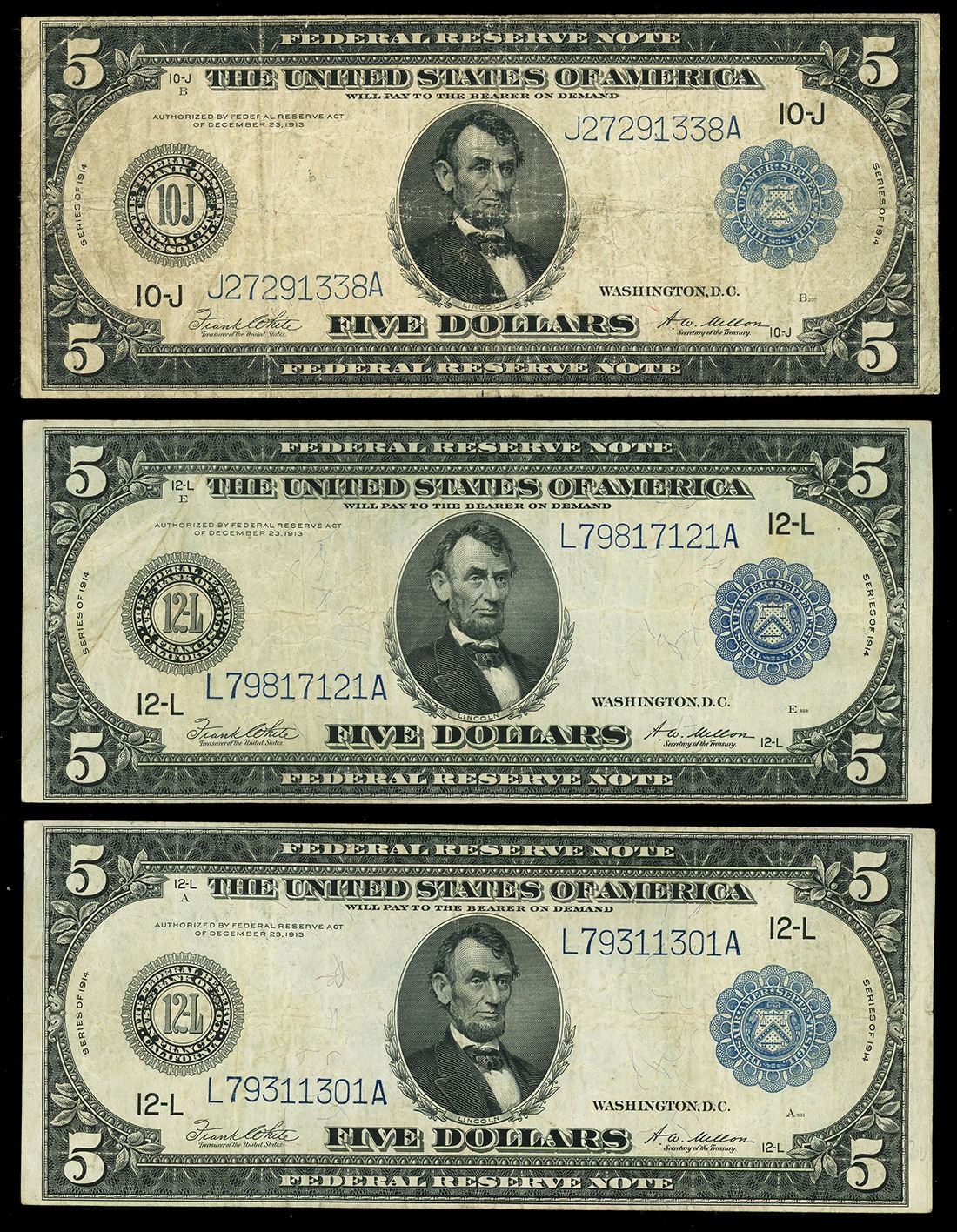 UNITED STATES, lot of three $5 Federal Reserve Notes, series of 1914.