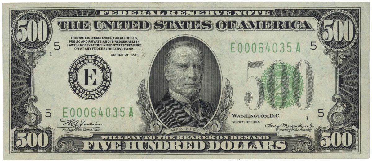 $500.00. 1934. FR-2201. No E00064035/A. PMG graded About Unc-55.