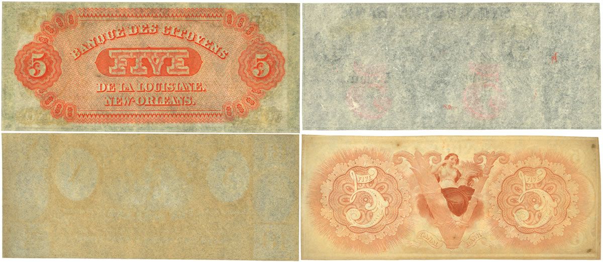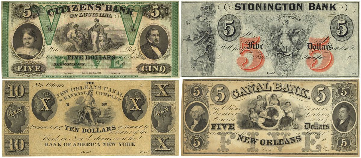 Lot of four (4) unissued obsolete US banknotes. $10 New Orleans Canal & Banking Co.; $5 Canal Bank of New Orleans; $5 Stonington Bank of Connecticut; $5 Citizen's Bank of Louisana. All are Uncirculated unsigned remainders. Lot of four (4) notes.