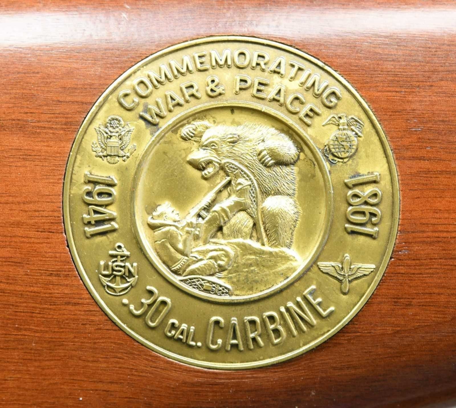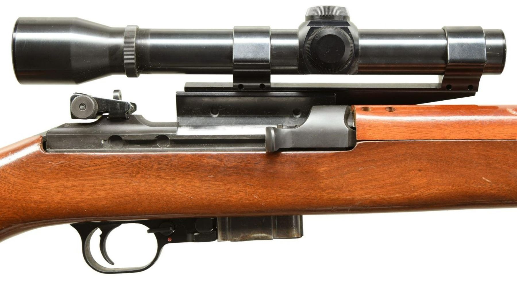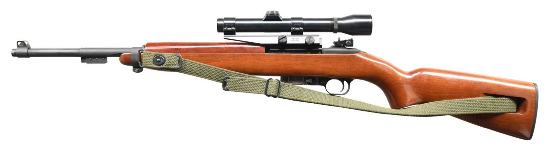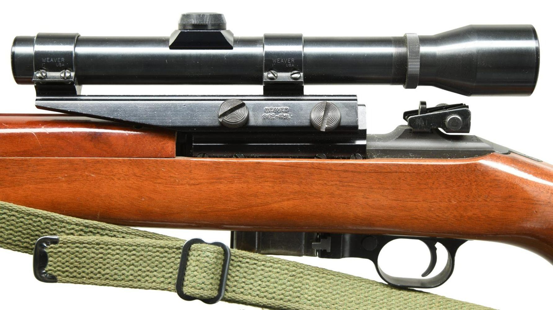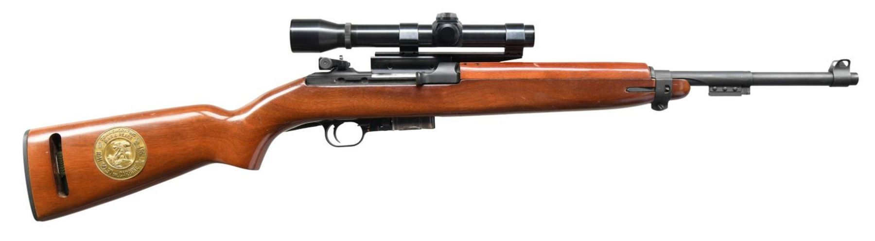 AUTO M1 CARBINE. Cal. 30 Carbine. S# 000450. Bbl. 18". Approx. 500 made in 1981 using a separate S# sequence. Originally fitted in a hard case w/ accessories. Now retaining only its Weaver Telescopic sight & green web sling. Rifle has standard M1 carbine configuration including bbl. band w/ bayonet lug, stamped adj. rear sight, blade front sight w/ protective ears. Rotary safety. Mag. catch w/ 30 rd. extension. Weaver 2.5 power scope w/ duplex reticle. Marked on top forward end "M2.5 / UNIVERSAL / FIREARMS / MADE IN USA / BY WEAVER". Scope utilizes Weaver side mt. Hardwood stock & handguard. Buttstock has circular medallion w/ dates & shows man confronting enraged bear. MAGS: 1 shop made conversion from standard 15 rd. mag. CONDITION: stock set has light wear & scattered handling marks w/ notable dent on right side of handguard. Metal retains most of its factory blue-black finish. Bore shows worn lands turning dark in grooves. PROVANANCE: the Collection of Gun Sport Ltd owned by Jon R. Thomas. (23-3492/RW). MODERN. $500-800.