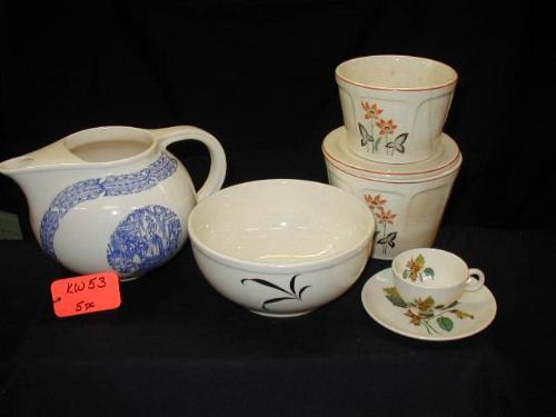 UNIVERSAL ASST. LOT INCLUDES (1) 7 3/8in CAMBRIDGE BOWL, (1) 6 1/4in DIA. 4 1/2in T. CAMBRIDGE CANNISTER, (1) 5 1/8in DAI. 3 1/2in T CAMBRIDGE CANNISTER (NO LID & STRESS CRACK), (1) BALL PITCHER EMPRESS IVORY (W/SPOUT CHIPS), (1) BALLERINA DEMI CUP & SAUCER,