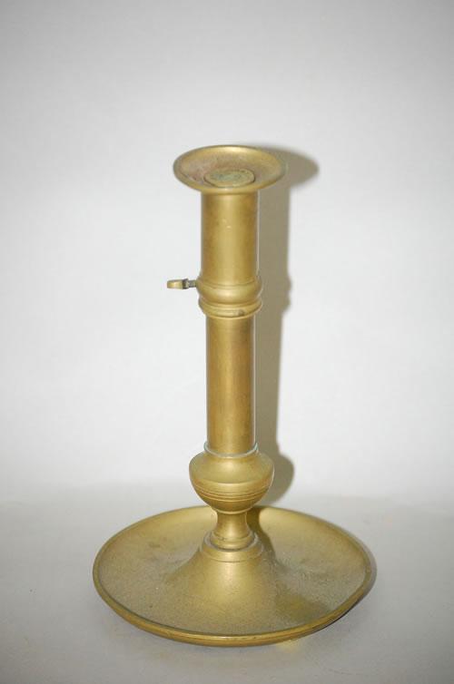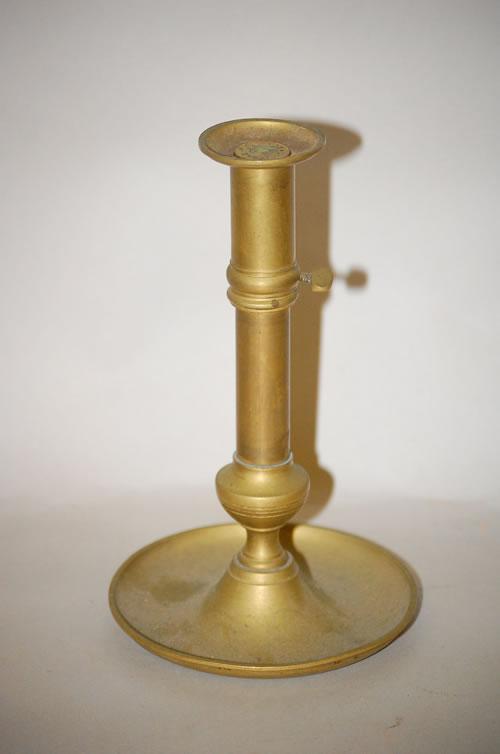 UNIVERSEL BRASS ADJUSTABLE HEIGHT CANDLESTICK - BRASS CANDLESTICK W/ ADJUSTABLE COLLAR & SET SCREW, FLARED BOBECHE, TURNED SHAFT & WIDE DRIP PAN-SIGNED UNIVERSEL E M BTE S.G.-D.G. (8 1/4" T UP TO 10 1/4" T, 5" W) - WEAR, OXIDATION, IMPERFECTIONS