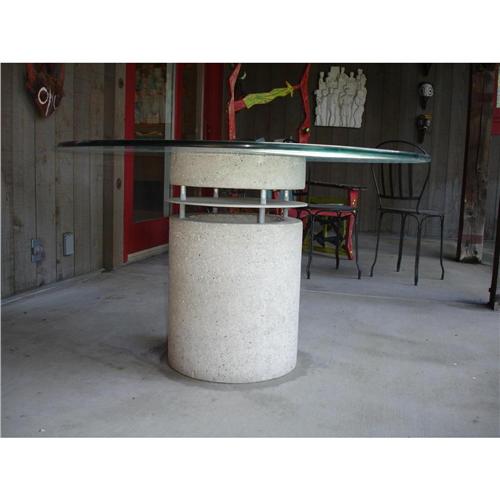 A CAST CEMENT AND GLASS ROUND TABLE- The beveled glass round top supported on a cast cement cylindrical standard interrupted by a reticulated iron disk.