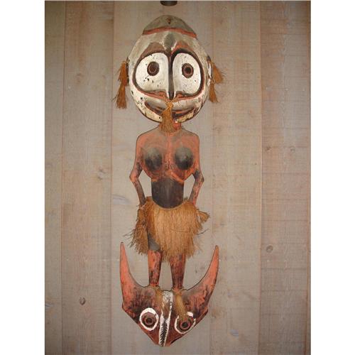 A NEW GUINEA PAINTED AND APPLIQUÉD WOOD PILLAR FIGURE- Modeled as a standing woman with a raffia dress.