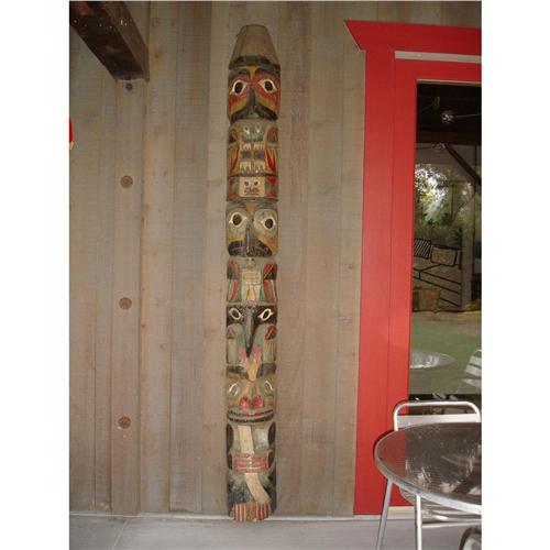 A NORTHWEST INDIAN CARVED AND POLYCHROMED WOOD TOTEM POLE- Split columnar form crested by a raven mask over a second raven mask, another bird, and a standing bear.