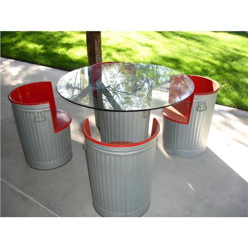 A WHIMSICAL FIVE-PIECE ALUMINUM TRASHCAN LUNCHEON SET- Comprised of a round glass-top table and four chairs with brown-enameled seats and backs.