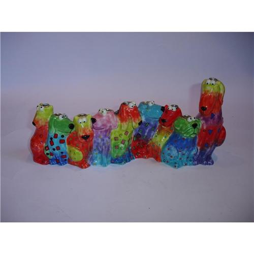 Group of 7 menorahs: A WHIMSICAL WROUGHT IRON MENORAH- Designed with nine seated dogs. A BLACK AND WHITE PAINTED WIREWORK MENORAH- Modeled as a standing zebra. Height: 10 inches. AN ENAMELED CERAMIC MENORAH- Modeled as New York City with the Statue of Liberty, the Twin Towers, and a foreground cab. AN ENAMELED METAL MENORAH Modeled with three musicians upholding a blue sash. AN ENAMELED CERAMIC MENORAH- Modeled with nine side chairs fronted by nine spittoons. A WHITE METAL MENORAH- Modeled as nine chairs with pierced seats.
