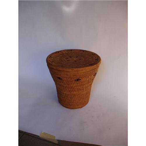 Nee Alter Basket: Textile sculpture. A tall woven basket with lift-off cover; the cover surmounted by ten diverse birds and centered by a palm.