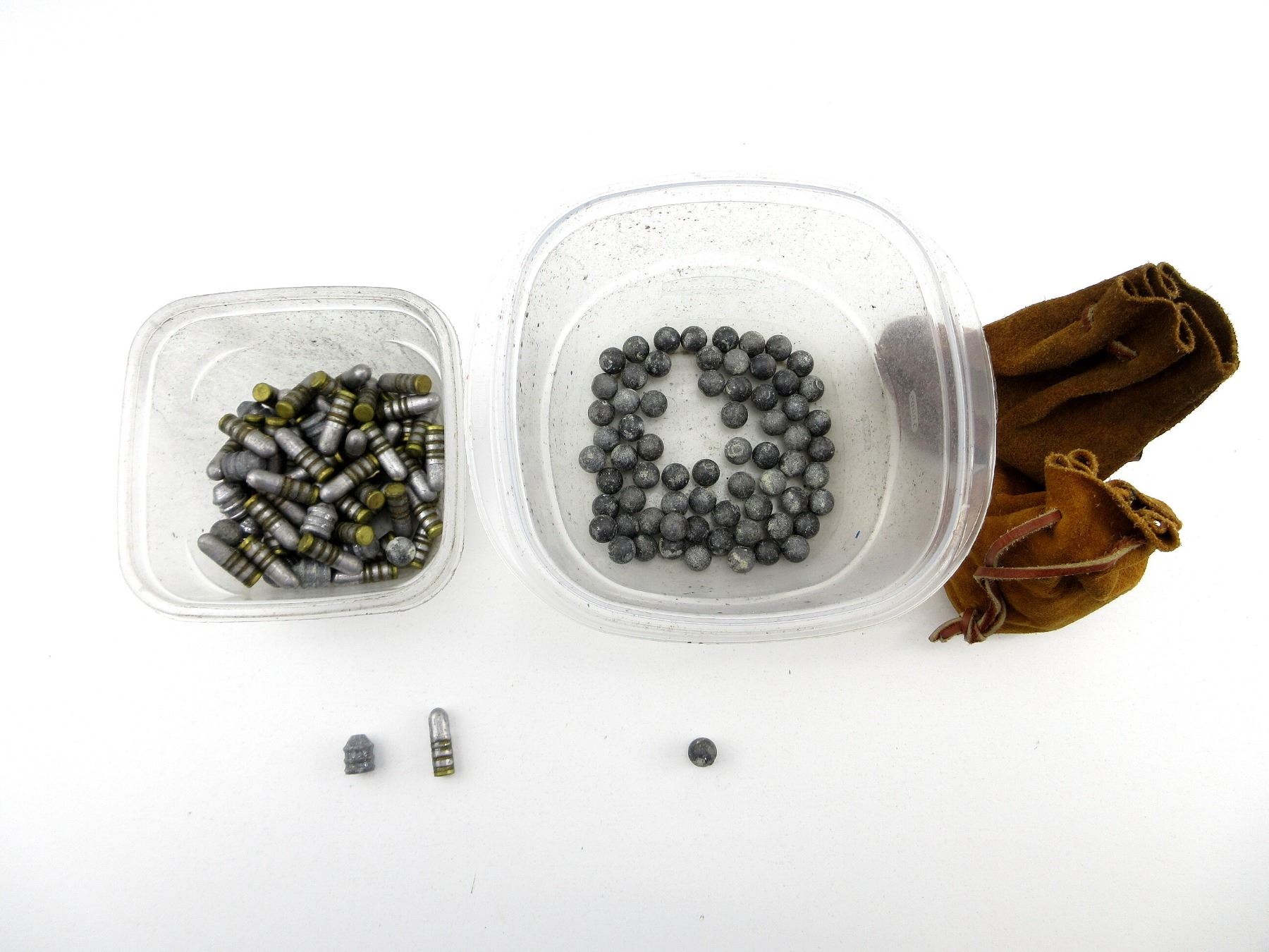 LOT INCLUDES; APPROX. 4.5 LBS BULLETS, APPROX. DIA .306", .446", .458", ETC., SOME WITH GAS CHECKS, (2) LEATHER POUCHES.