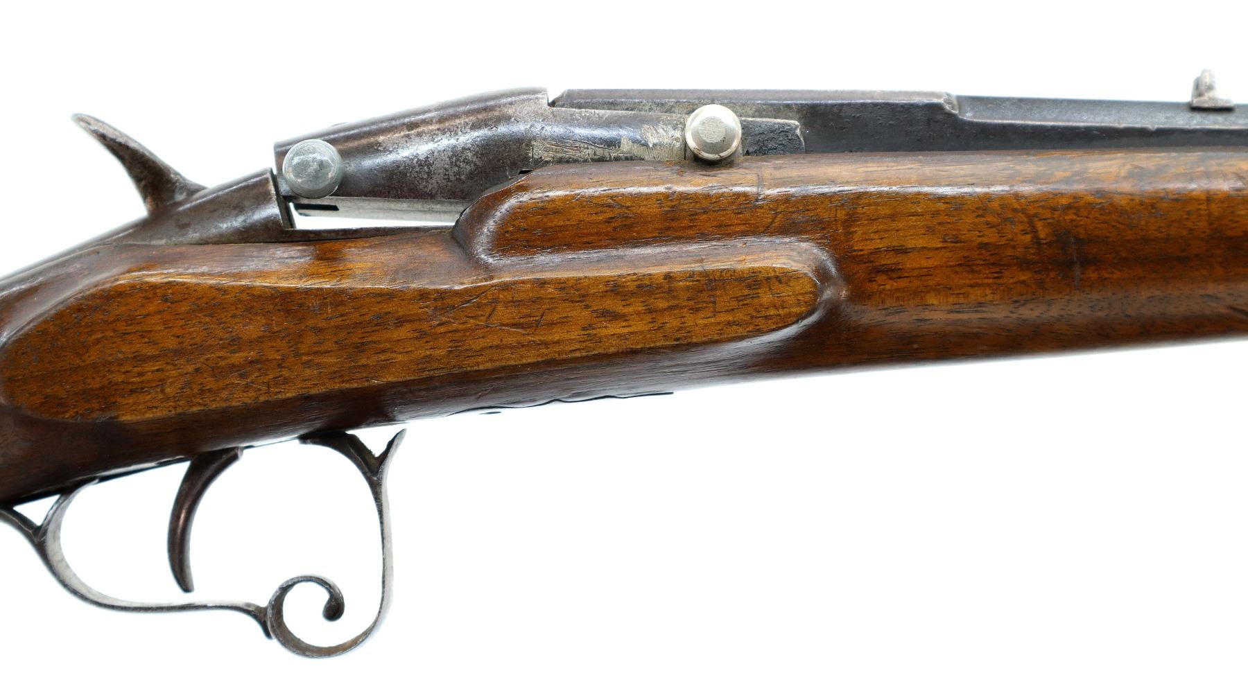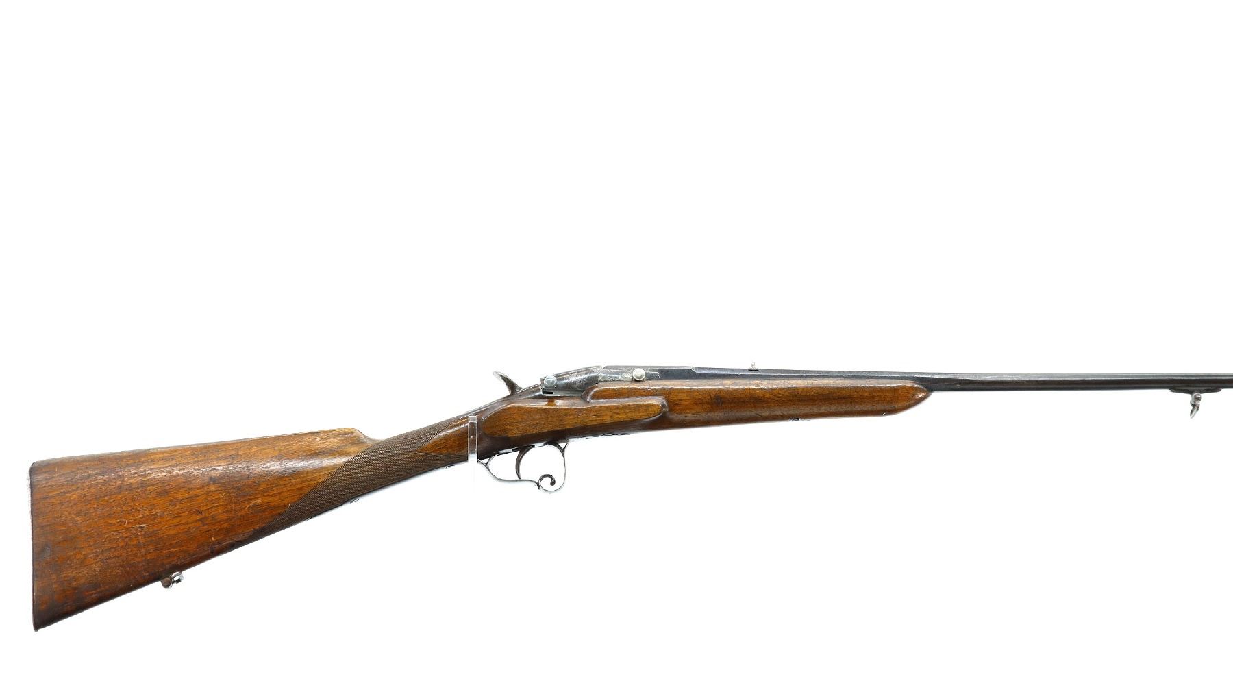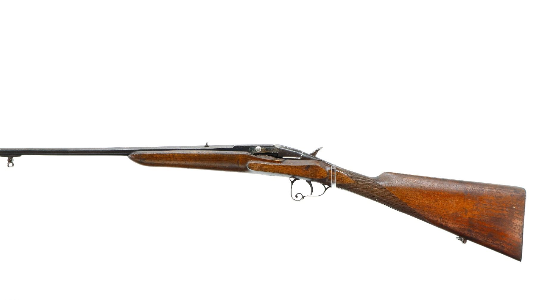 Main Description: Brass bead, u notched rear sight, blued finish, round barrel, breech block screws have been replaced, firing pin appears damaged, checkered spur hammer, mainspring missing or broken. One piece wood stock, checkered straight grip, stock chipped and cracked around receiver, smooth steel butt plate, sling swivels.
