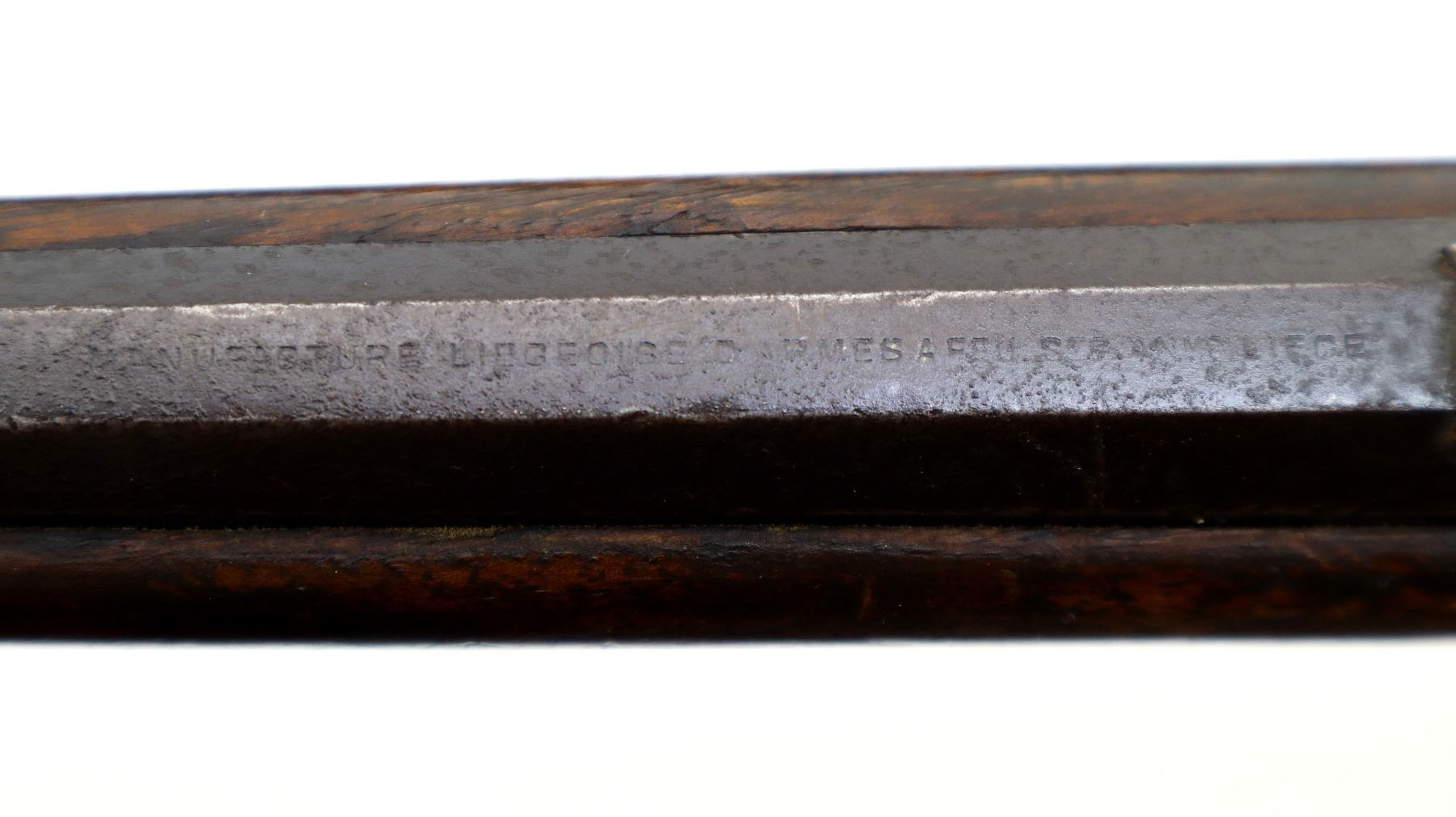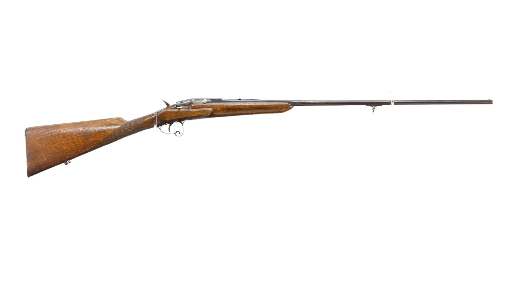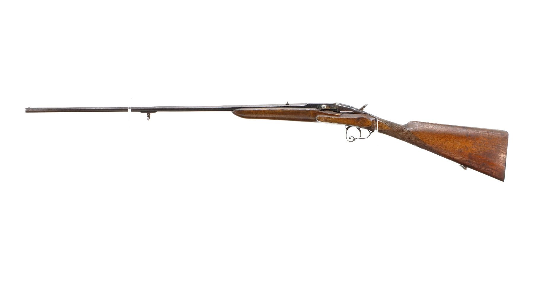 Main Description: Brass bead, u notched rear sight, blued finish, round barrel, breech block screws have been replaced, firing pin appears damaged, checkered spur hammer, mainspring missing or broken. One piece wood stock, checkered straight grip, stock chipped and cracked around receiver, smooth steel butt plate, sling swivels.