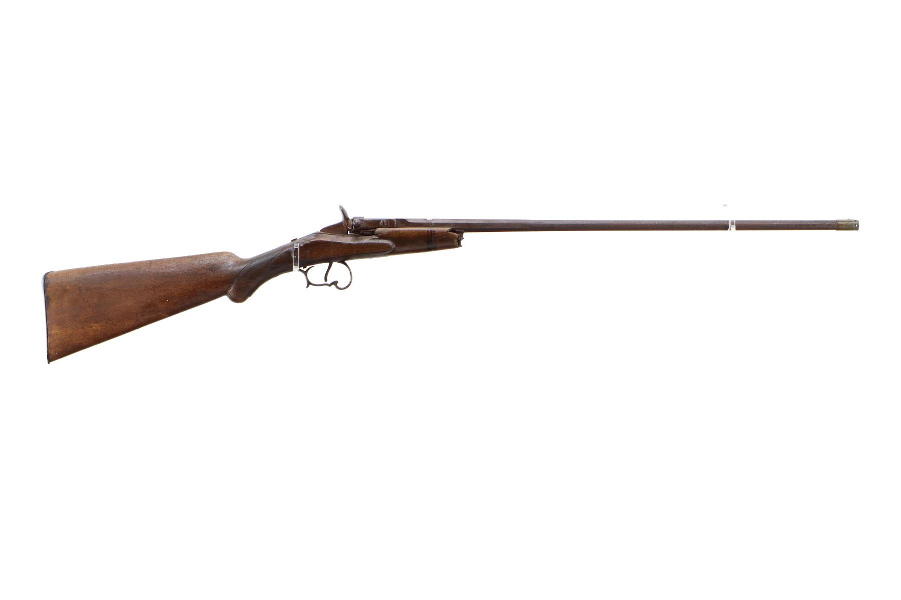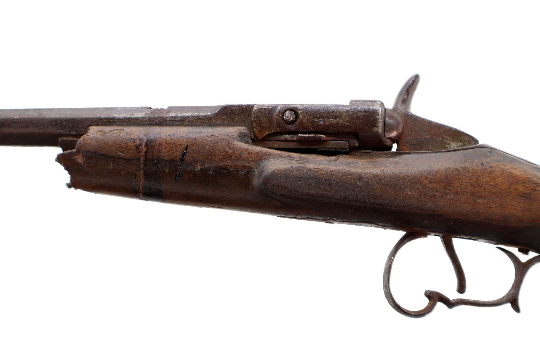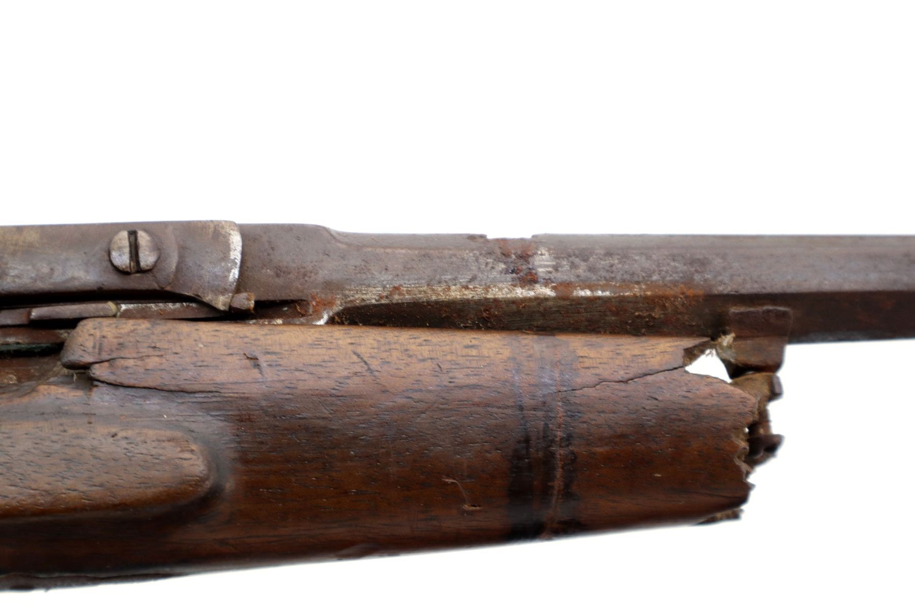 Main Description: Brass bead, missing rear sight, dovetail present, tapered round barrel, spur hammer and round opening lever. One piece wood stock, forend tip is broken off, checkered pistol grip chipped and cracked behind receiver and action, smooth steel butt plate.