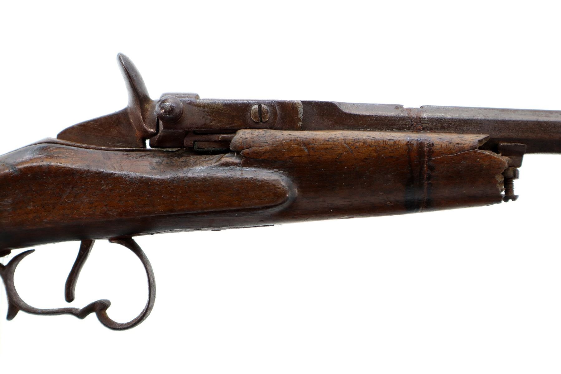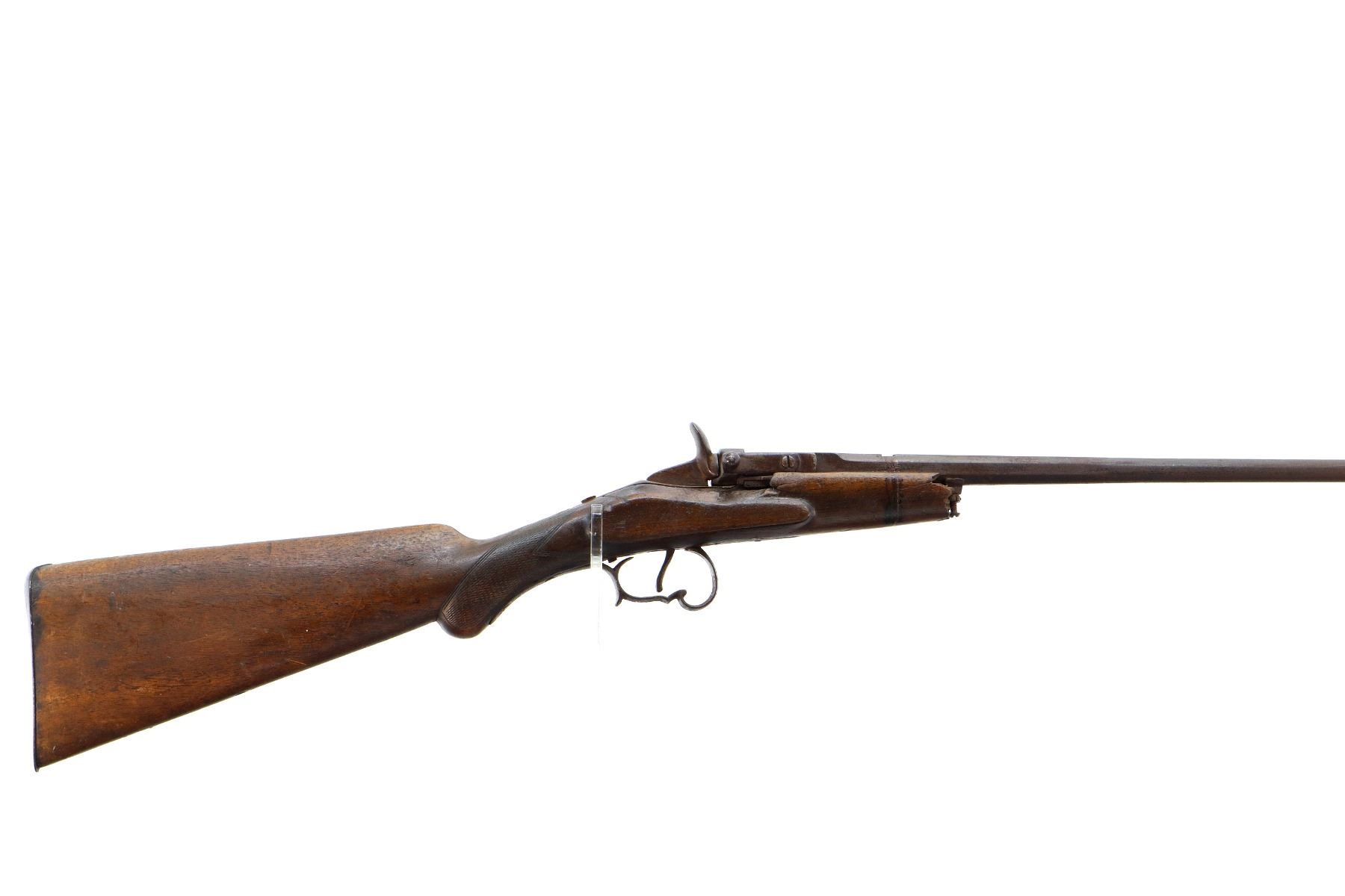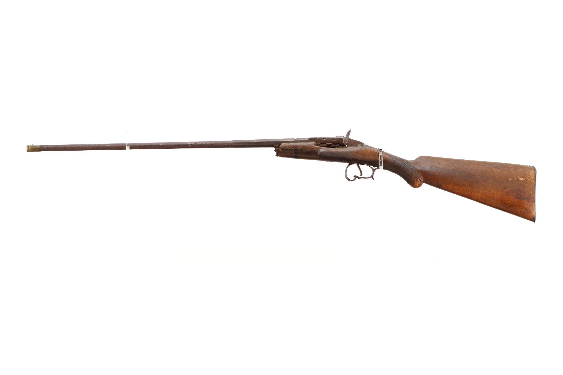 Main Description: Brass bead, missing rear sight, dovetail present, tapered round barrel, spur hammer and round opening lever. One piece wood stock, forend tip is broken off, checkered pistol grip chipped and cracked behind receiver and action, smooth steel butt plate.