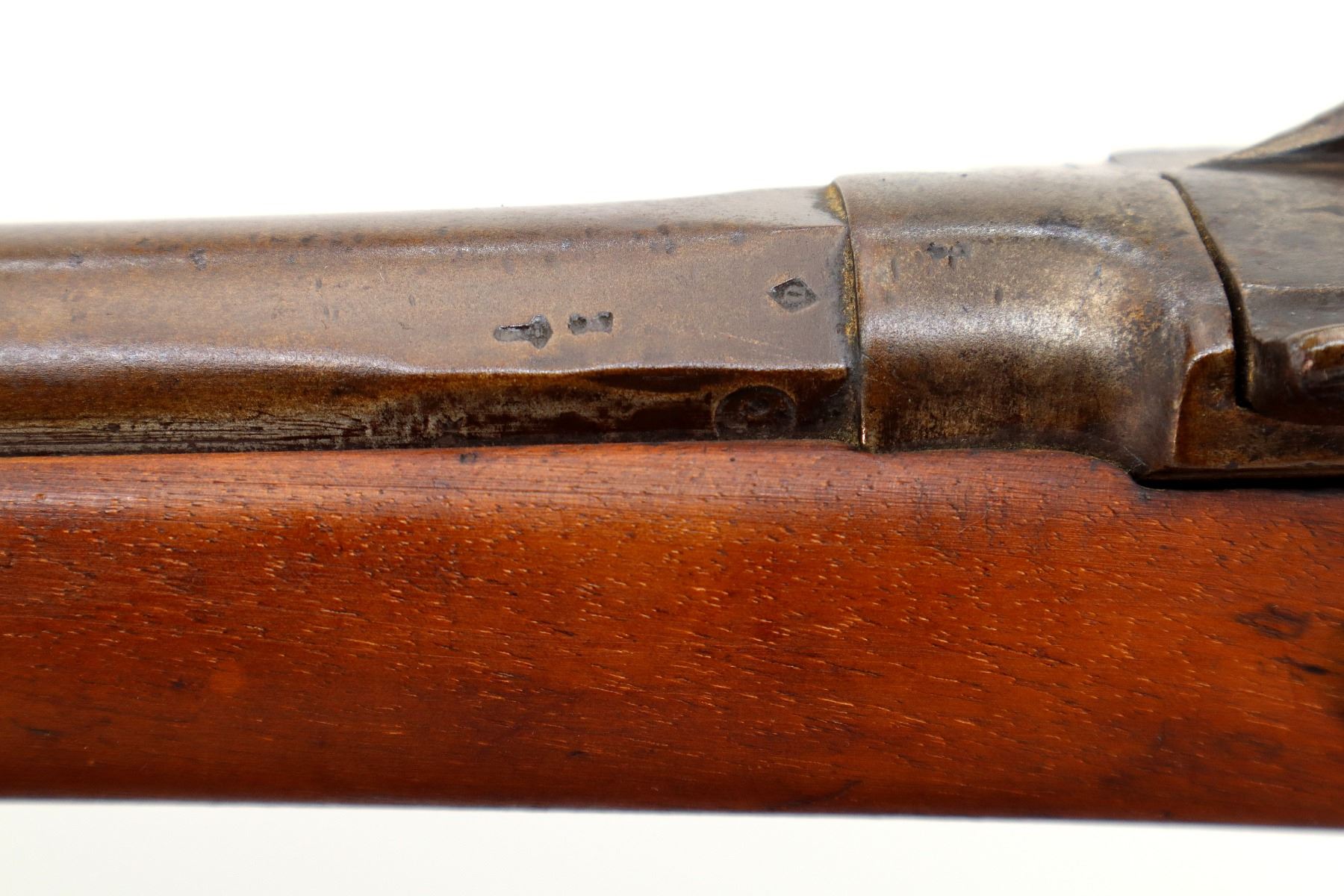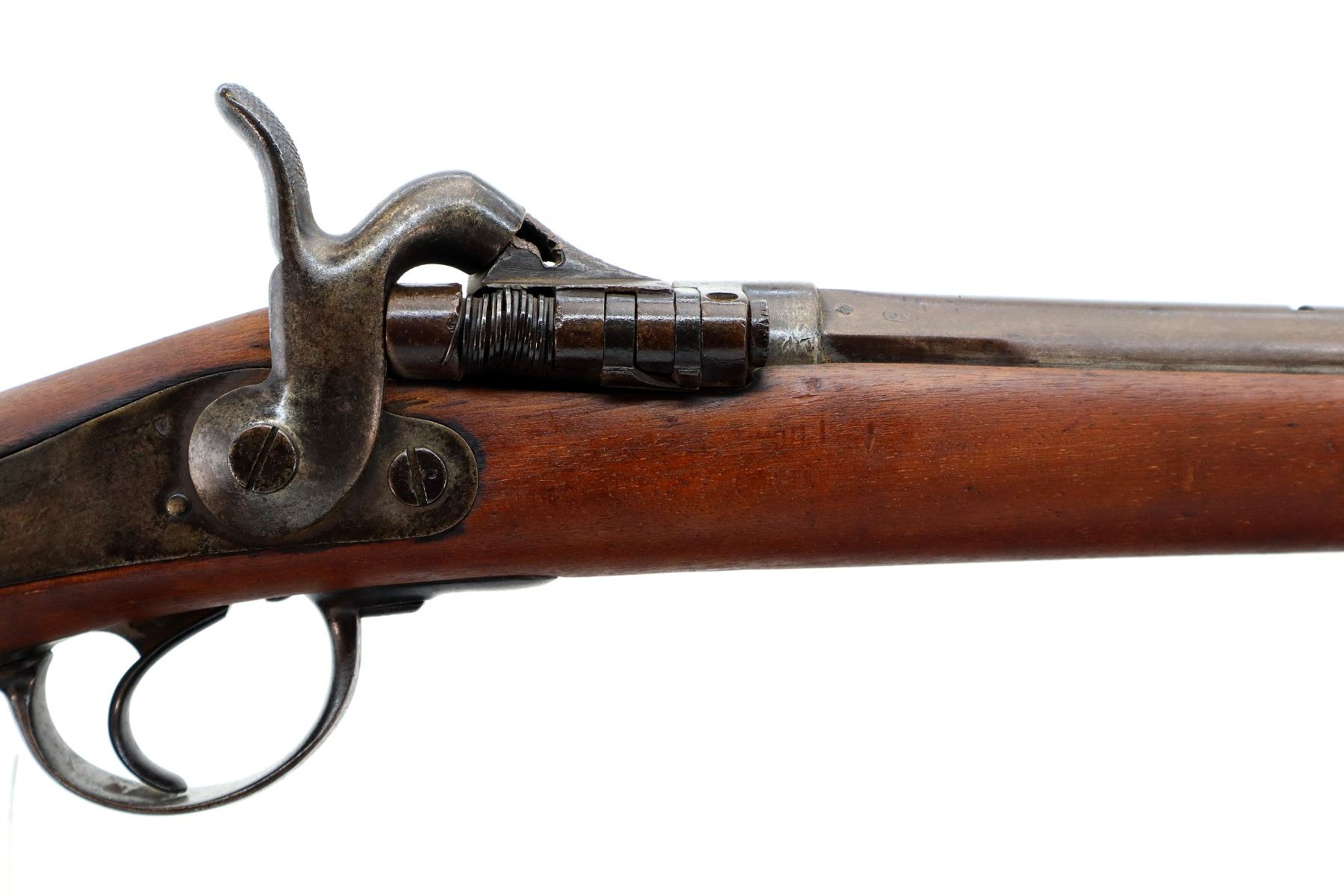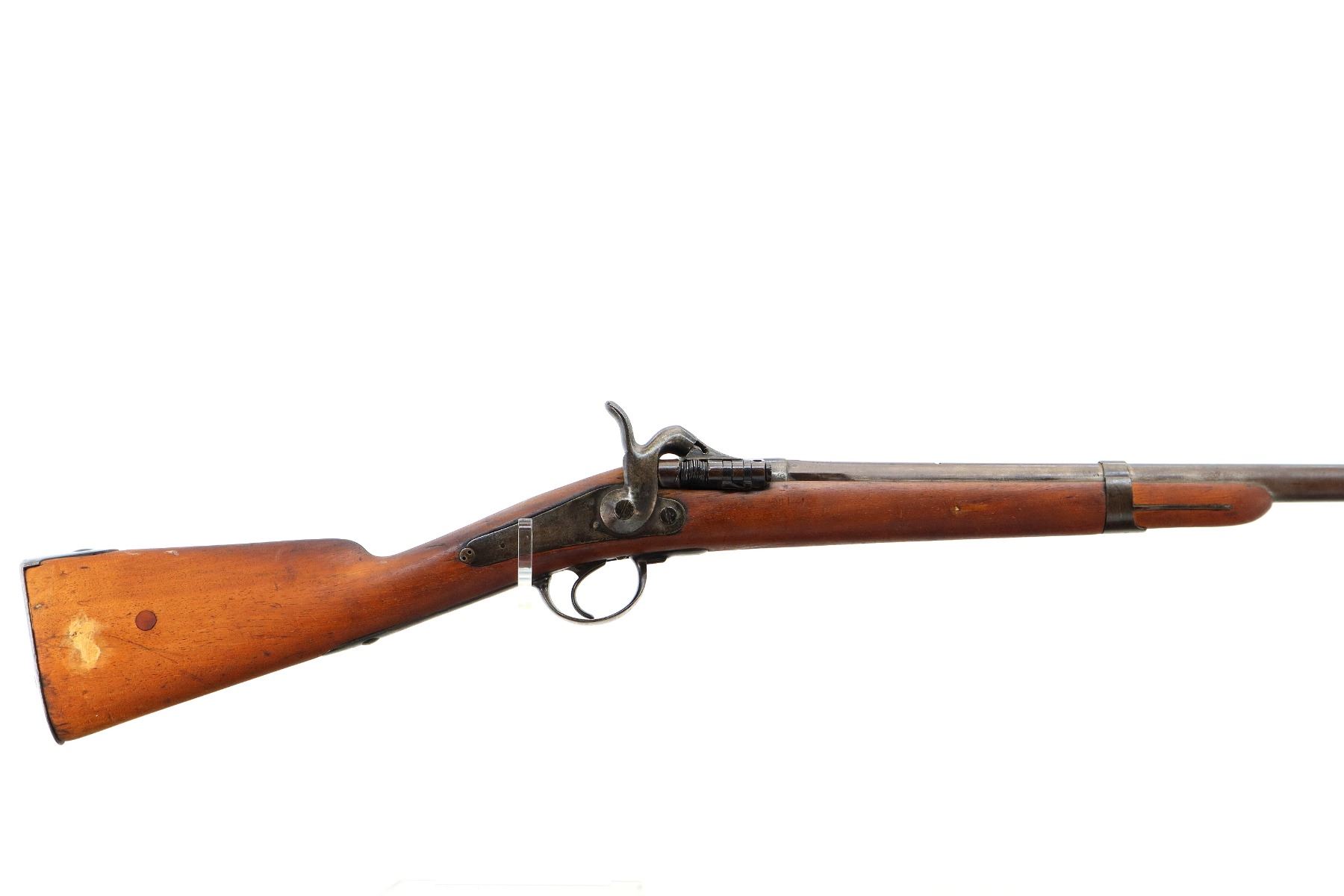 Main Description: Broken bead, missing rear sight, tapered round barrel, bolt is loose missing firing pin chipped and cracked, back action lock with checkered spur hammer that functions. One piece half length wood stock, straight grip cracked behind receiver, smooth steel butt plate, steel trigger guard.