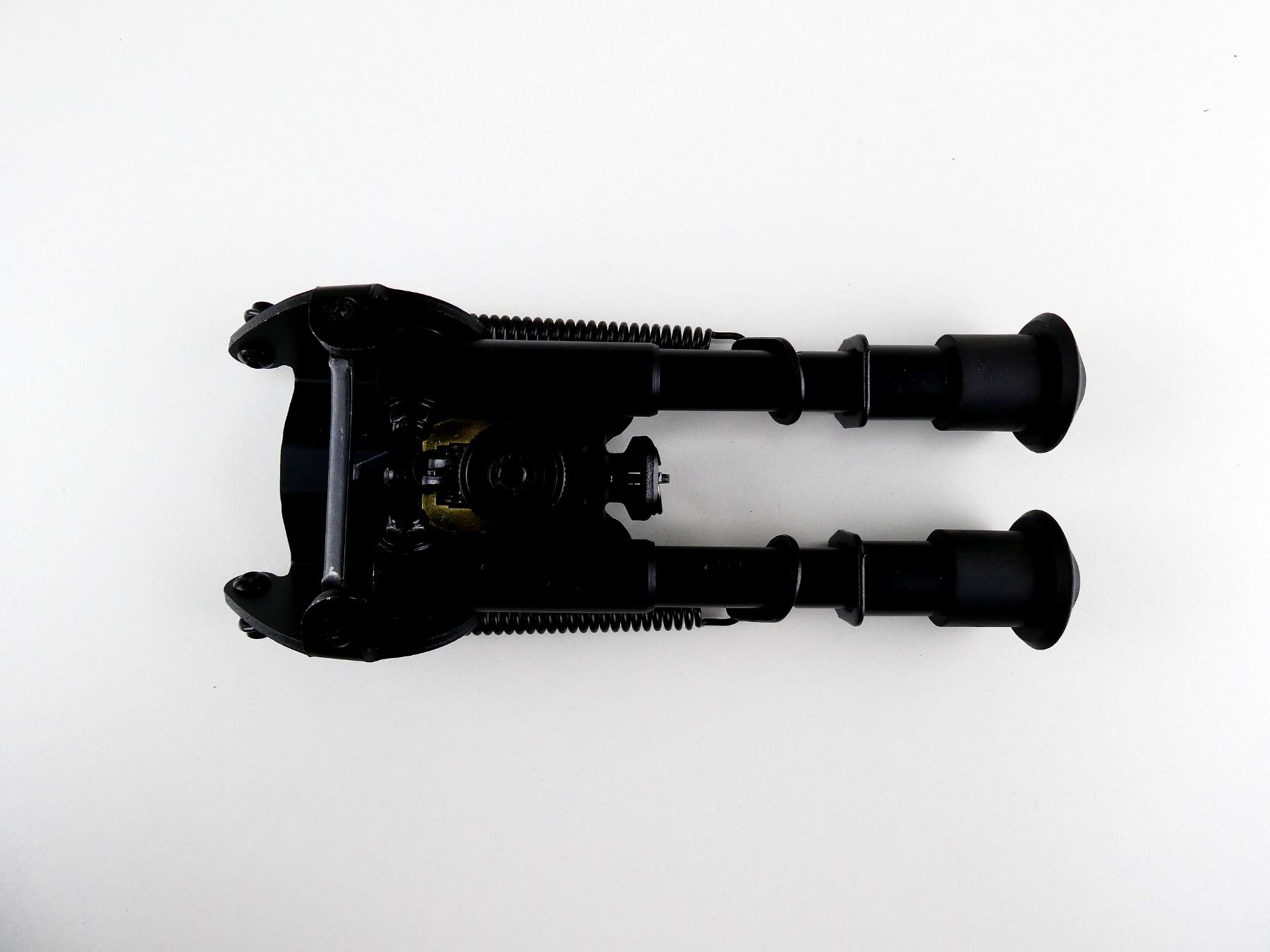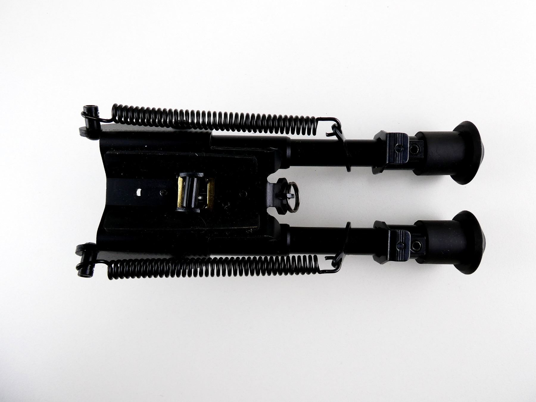 (1) BLACK ALUMINIUM BIPOD, WITH RUBBER FEET, SLING SWIVEL STUD ATTACHMENT, WITH MOUNT, SPRING LOADED LEGS, ADJUSTABLE LEGS FROM 6" TO 9". SEE PHOTOS.
