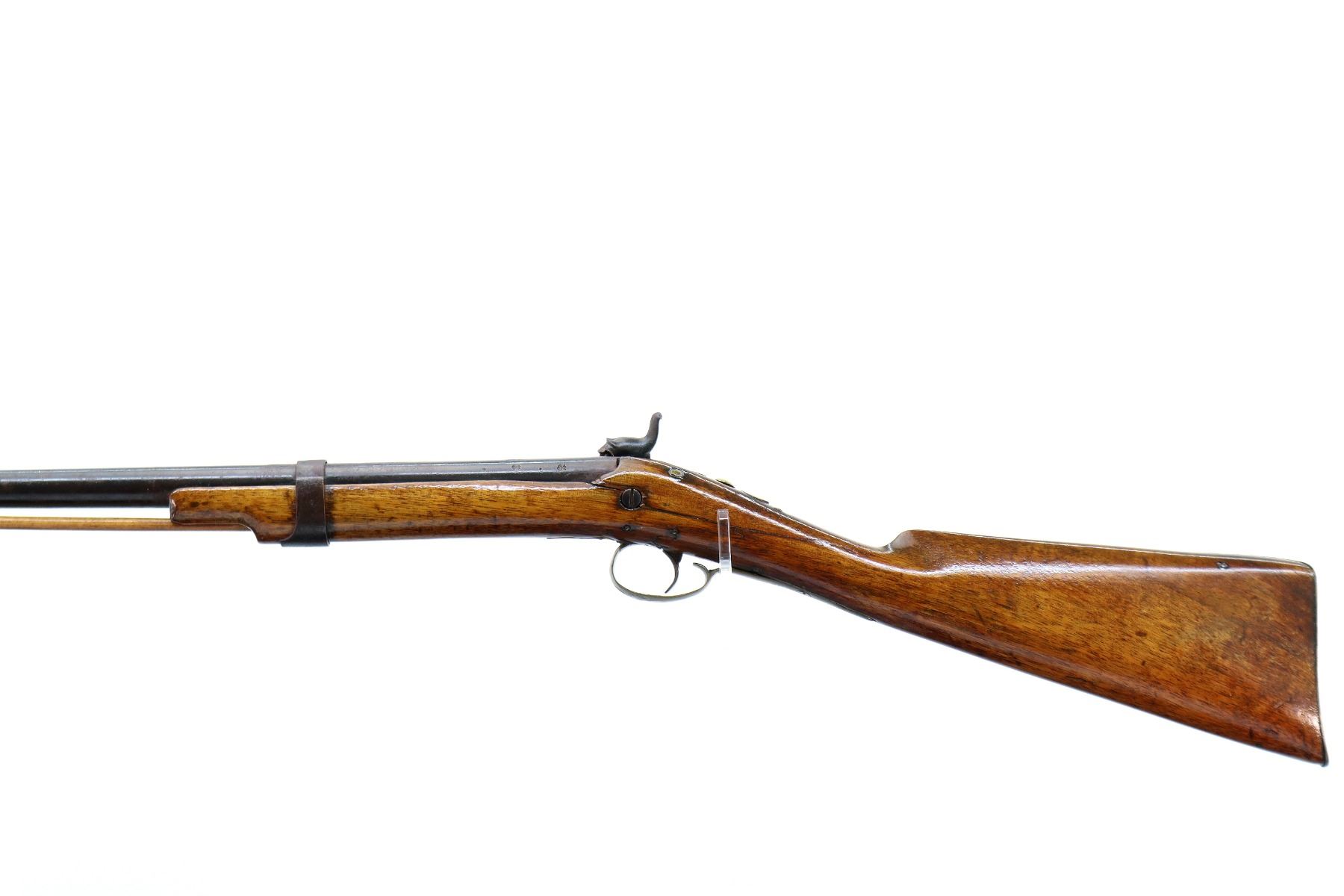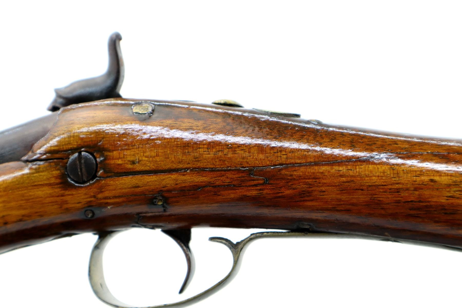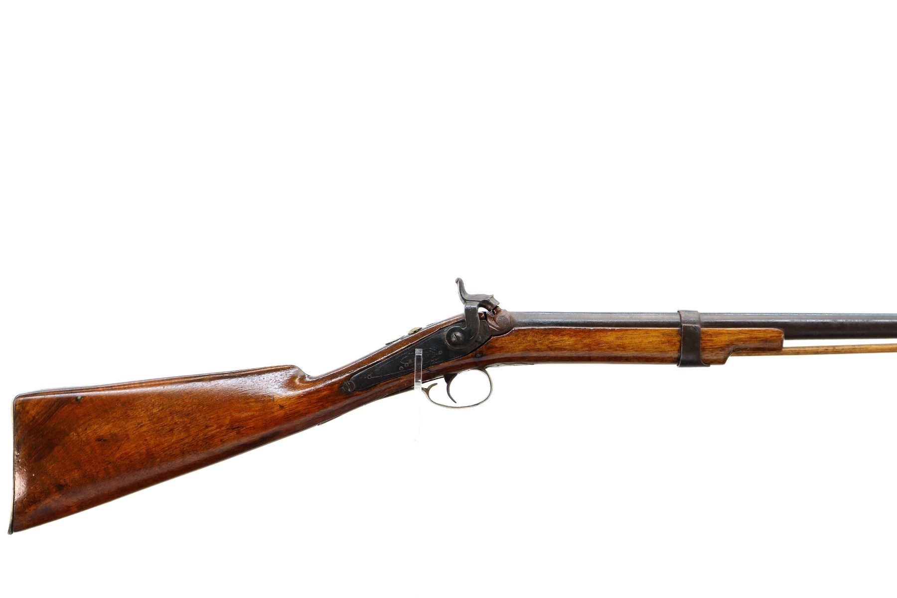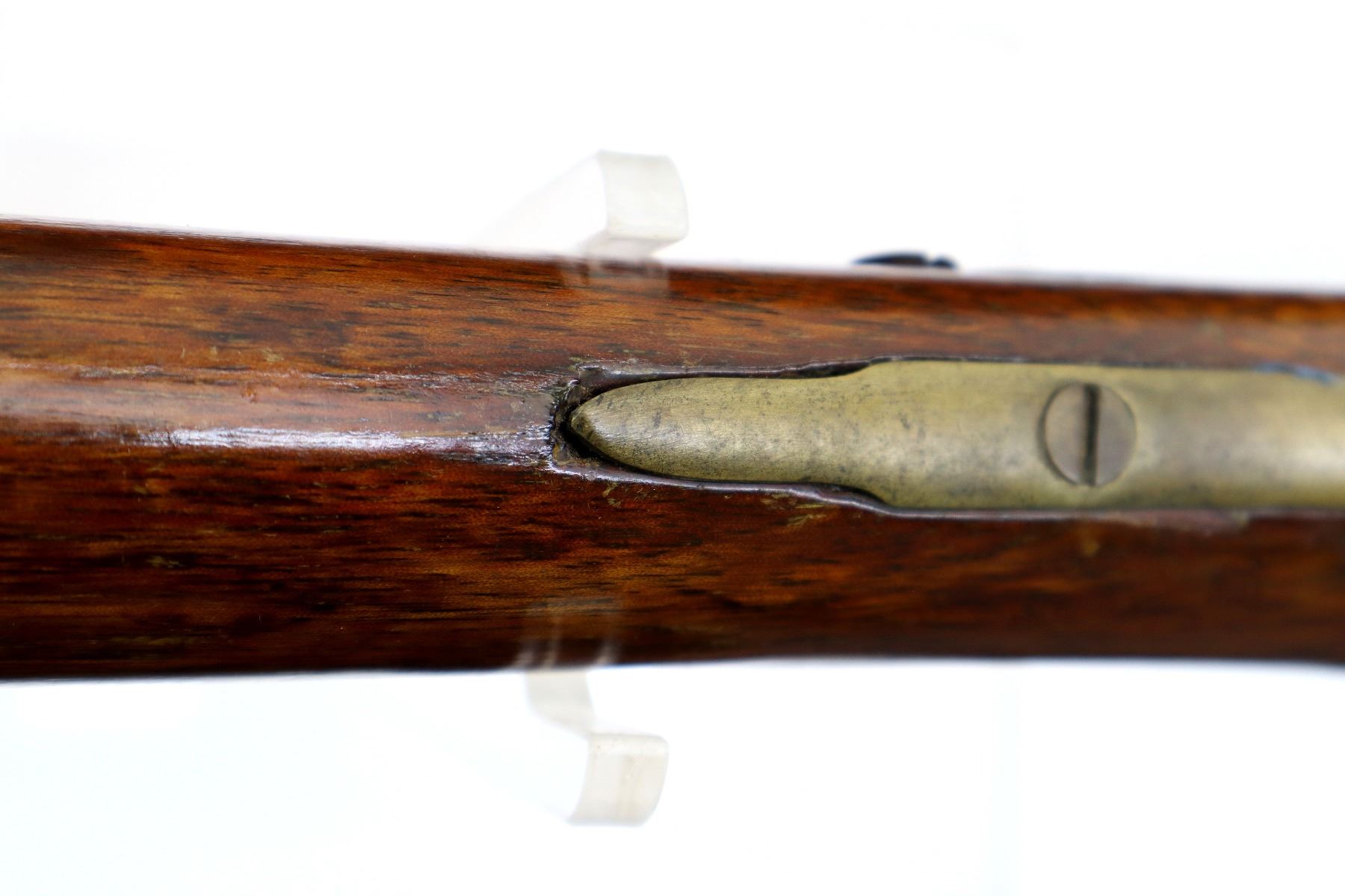 Main Description: Brass bead, tapered round barrel with British proof marks, engraved back action lock with checkered spur hammer that does not function, nipple is damaged. One piece half length wood stock, straight grip, stock chipped, cracked and repaired around trigger, behind barrel and lock. Smooth brass butt plate and trigger guard, steel barrel band, replaced wood ramrod with one loose holder.