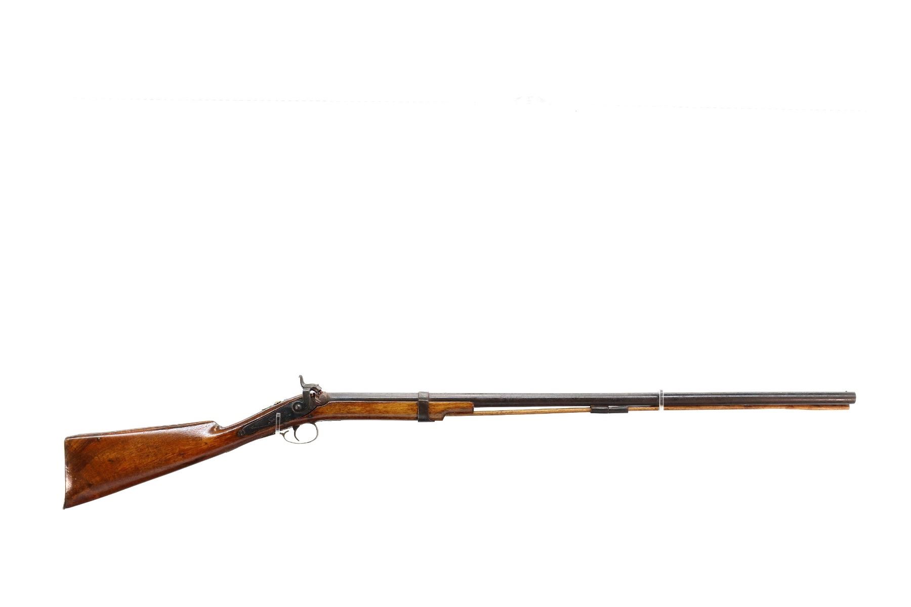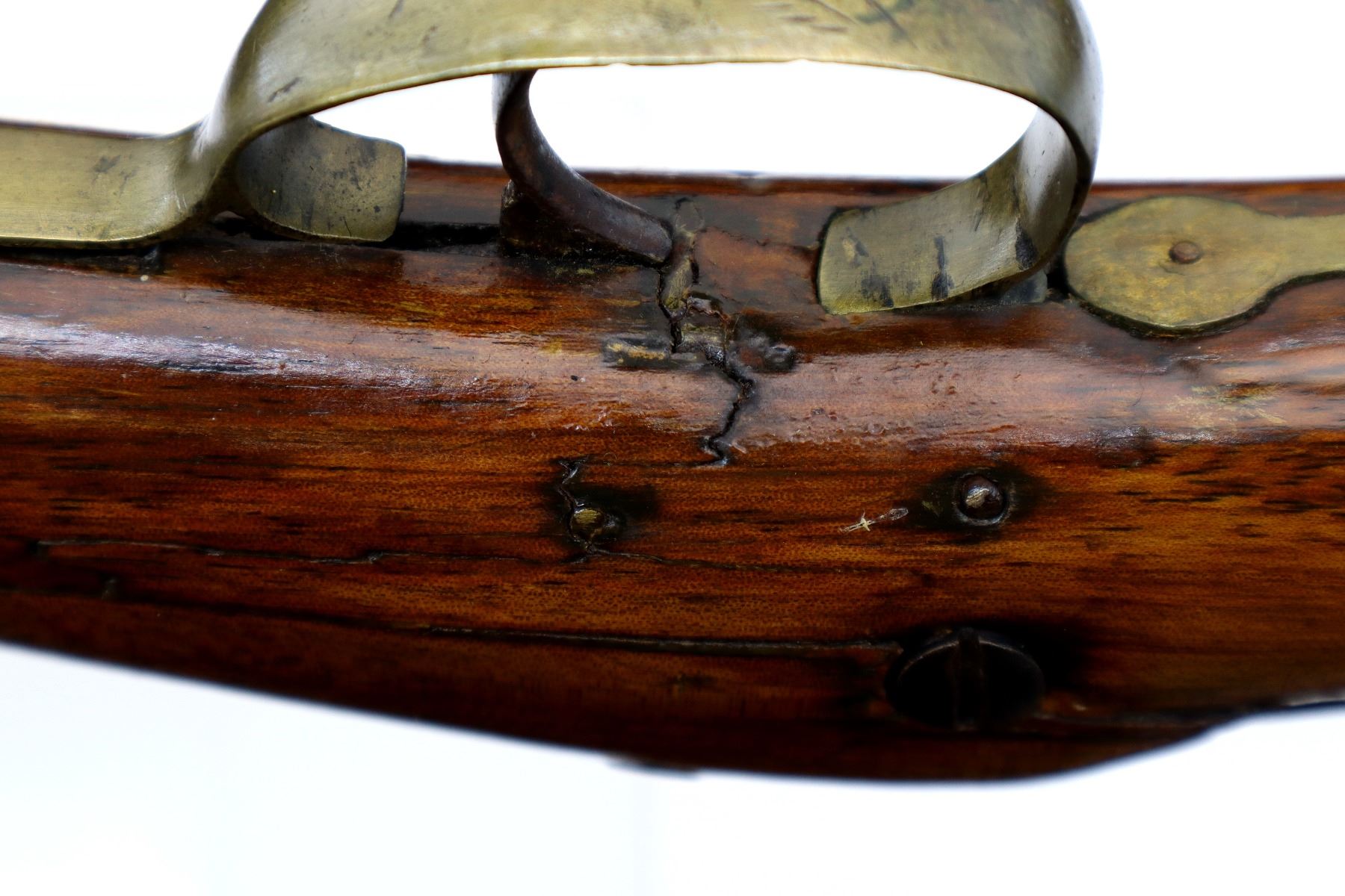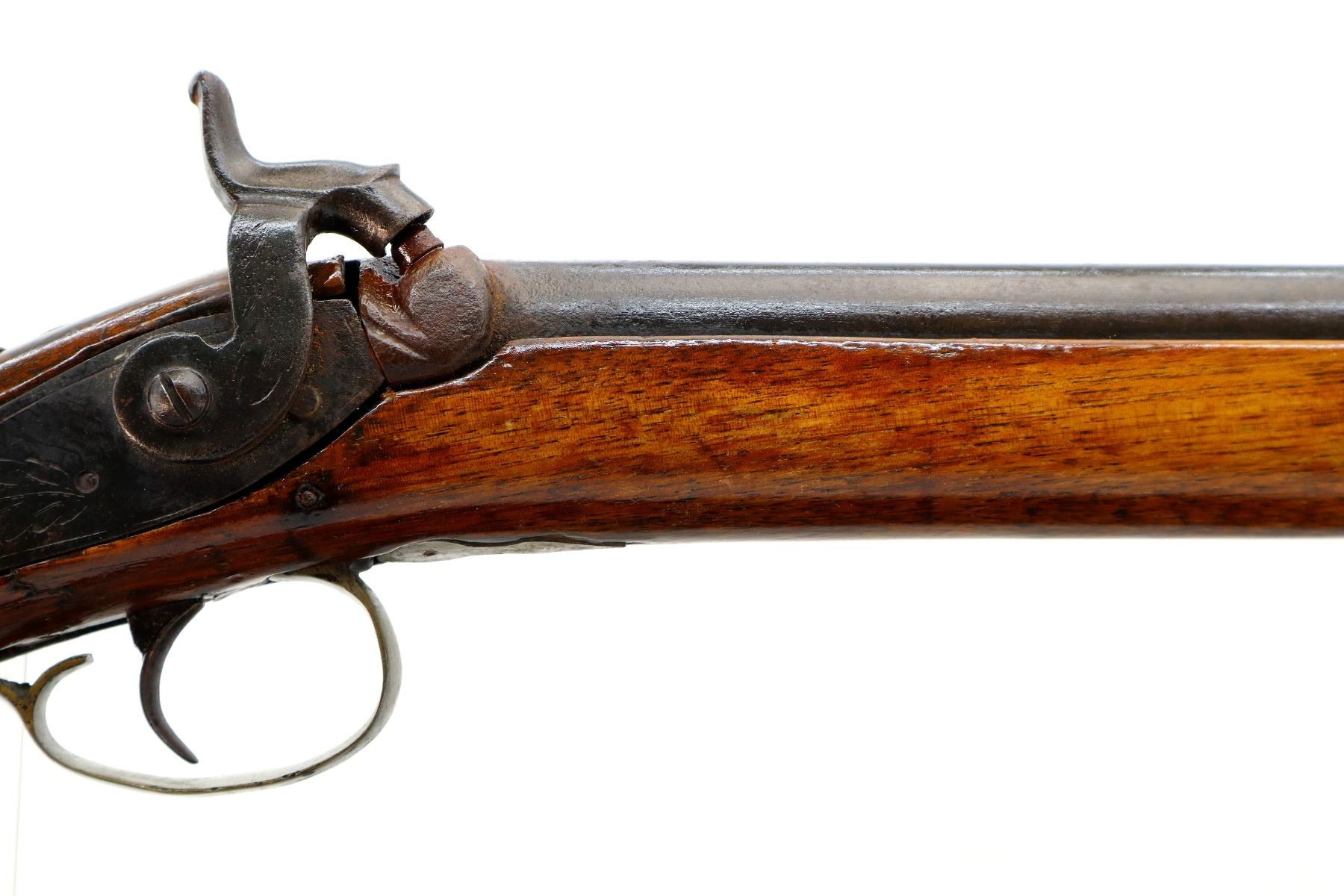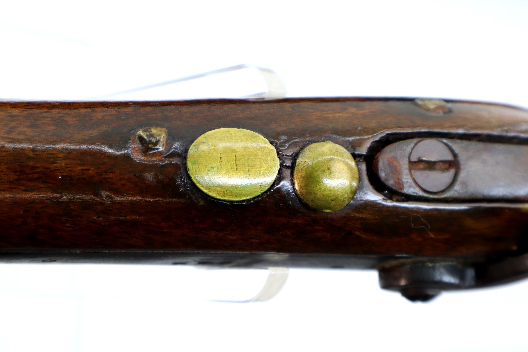 Main Description: Brass bead, tapered round barrel with British proof marks, engraved back action lock with checkered spur hammer that does not function, nipple is damaged. One piece half length wood stock, straight grip, stock chipped, cracked and repaired around trigger, behind barrel and lock. Smooth brass butt plate and trigger guard, steel barrel band, replaced wood ramrod with one loose holder.