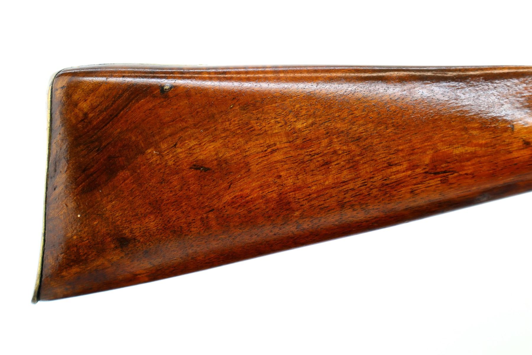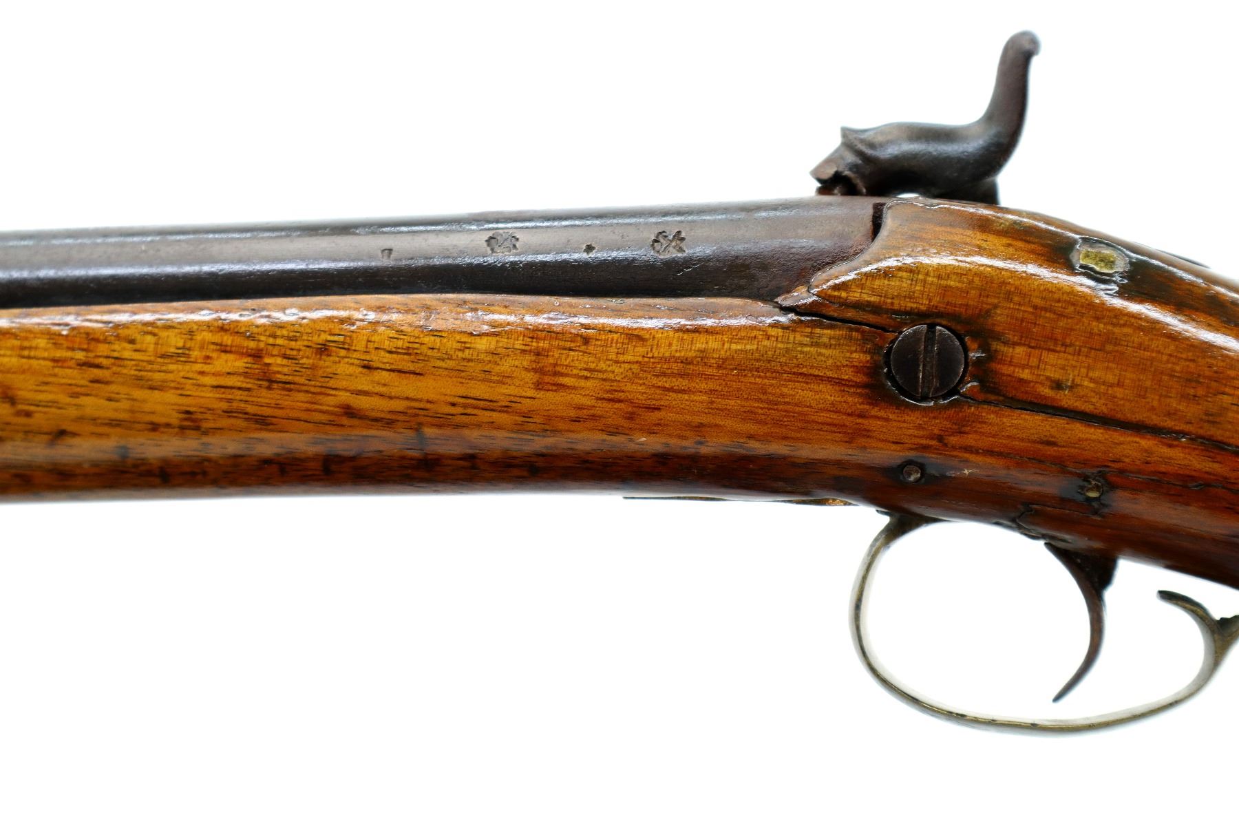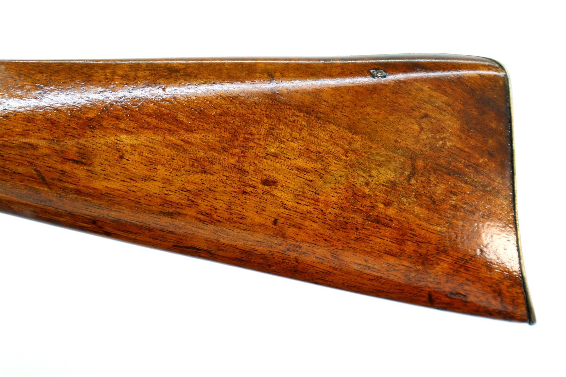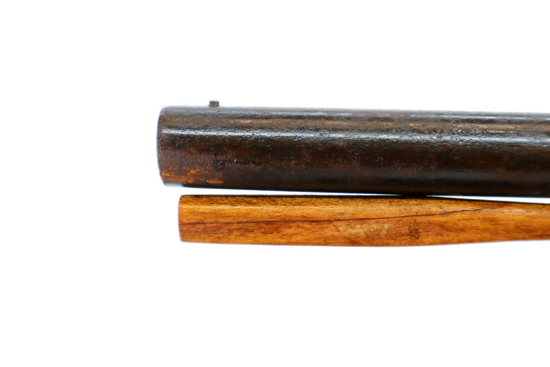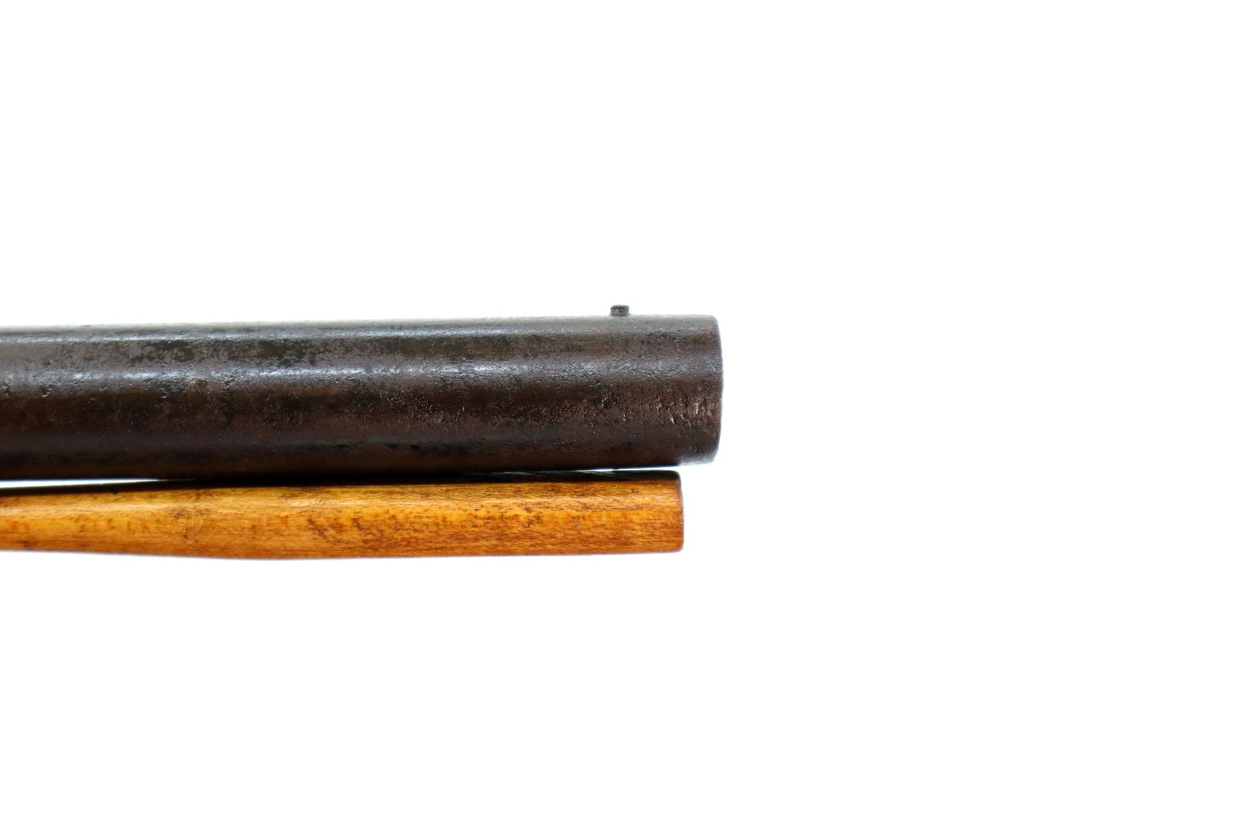 Main Description: Brass bead, tapered round barrel with British proof marks, engraved back action lock with checkered spur hammer that does not function, nipple is damaged. One piece half length wood stock, straight grip, stock chipped, cracked and repaired around trigger, behind barrel and lock. Smooth brass butt plate and trigger guard, steel barrel band, replaced wood ramrod with one loose holder.