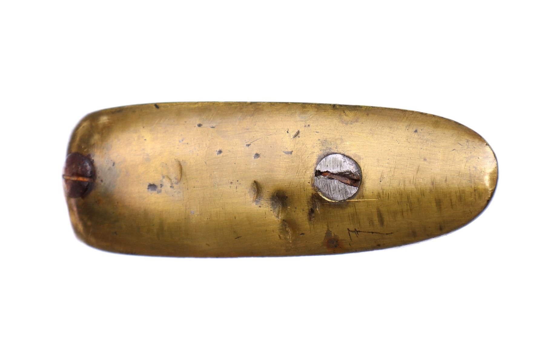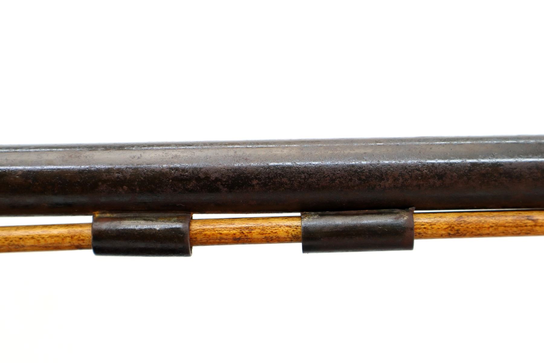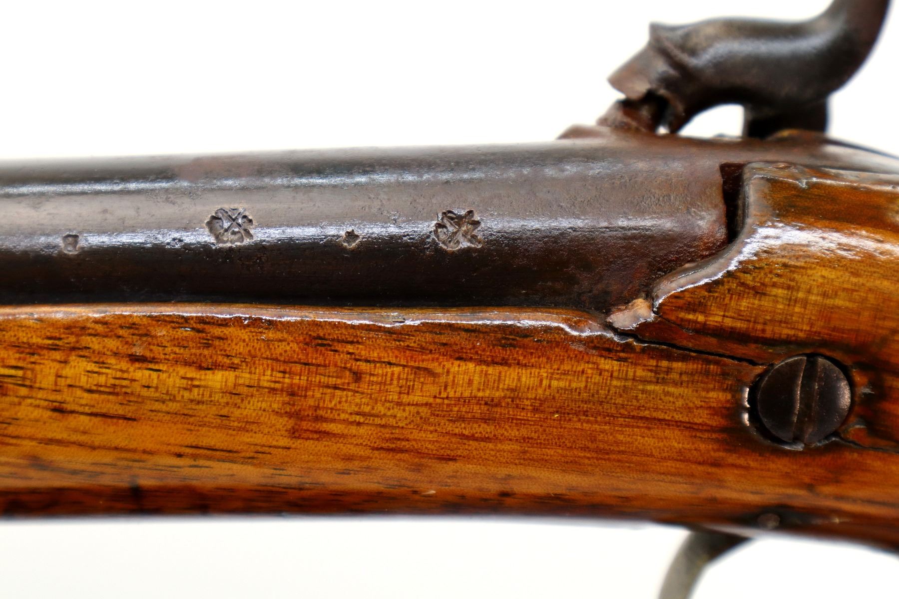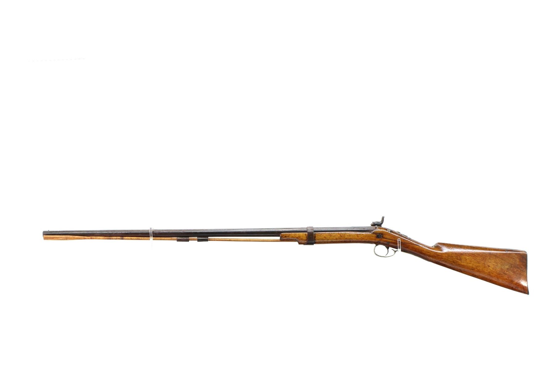 Main Description: Brass bead, tapered round barrel with British proof marks, engraved back action lock with checkered spur hammer that does not function, nipple is damaged. One piece half length wood stock, straight grip, stock chipped, cracked and repaired around trigger, behind barrel and lock. Smooth brass butt plate and trigger guard, steel barrel band, replaced wood ramrod with one loose holder.