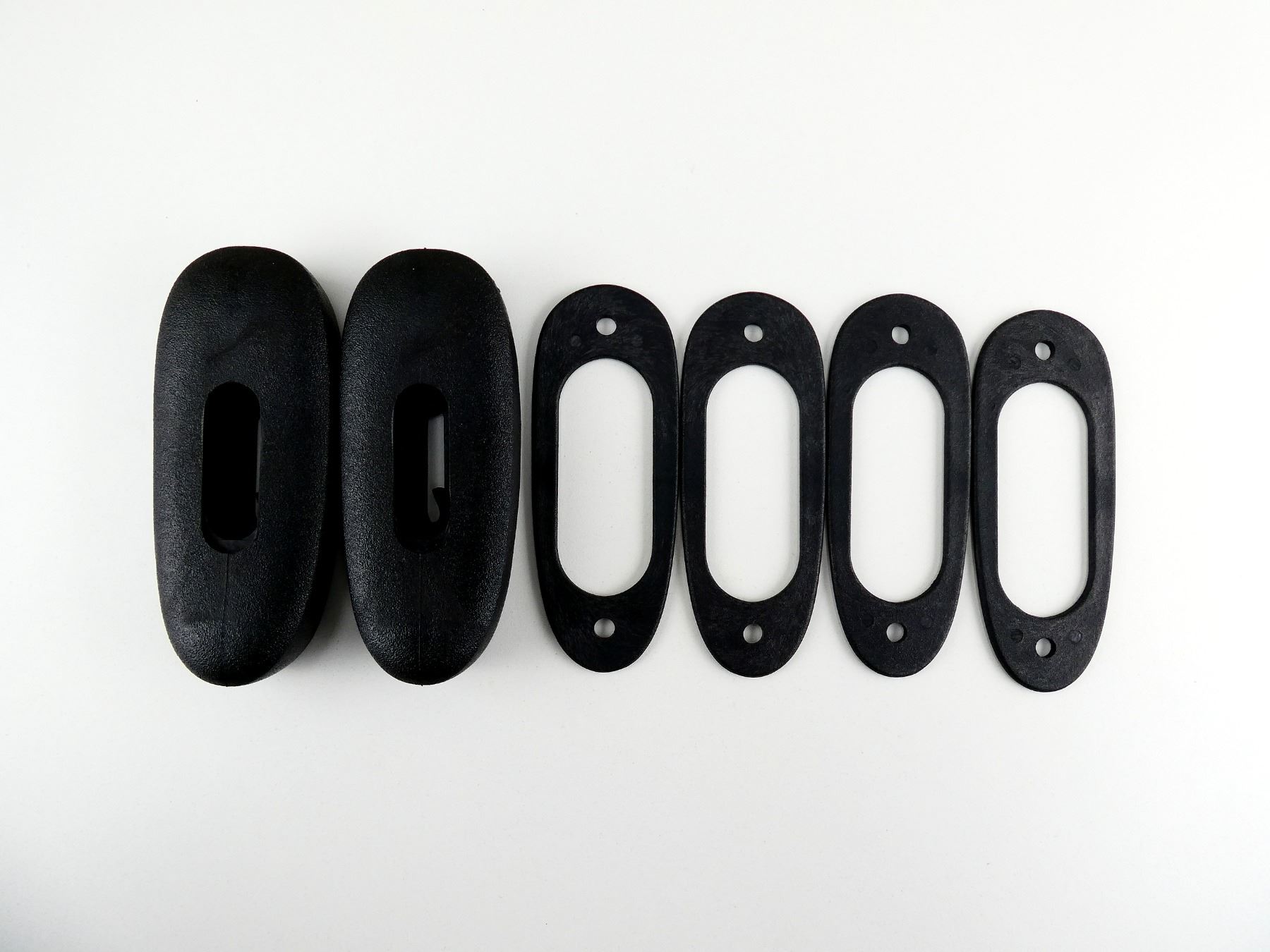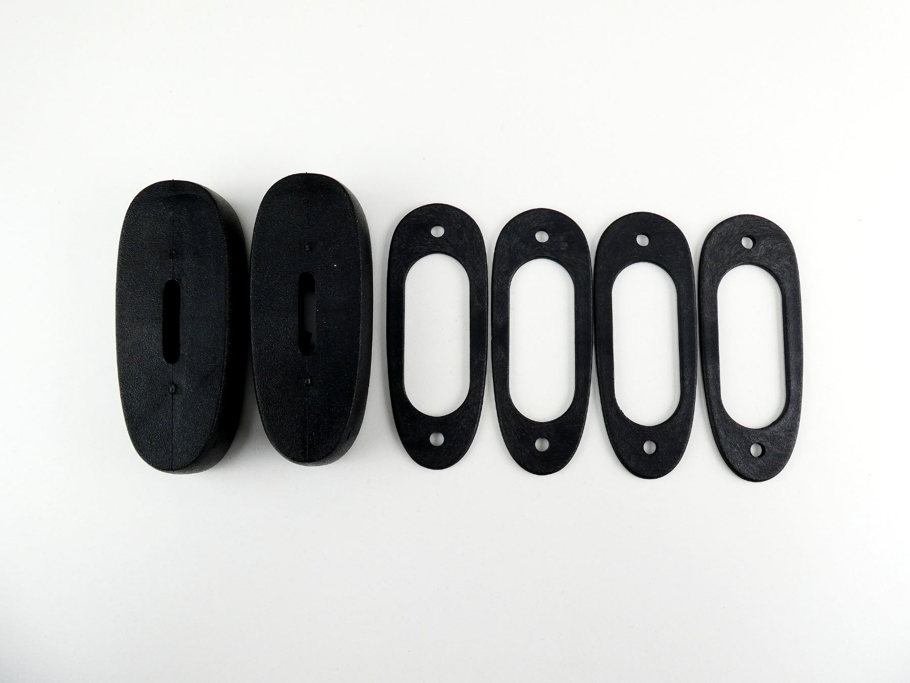 LOT INCLUDES; (2) UNKNOWN BLACK POLYMER BUTT PLATES, UNMARKED & (4) BLACK POLYMER SPACERS. MAY REQUIRE FITTING. SEE PHOTOS.